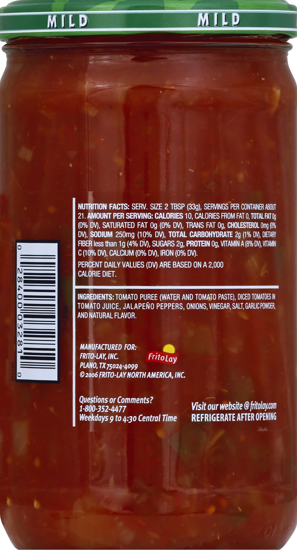 No gluten ingredients**.,TOSTITOS-branded salsa made from the freshest ingredients: diced tomatoes, jalapeno peppers, onions, and spices.,The perfect complement to TOSTITOS Tortilla Chips. Frito-lay, Inc., Plano,TX,75024-4099