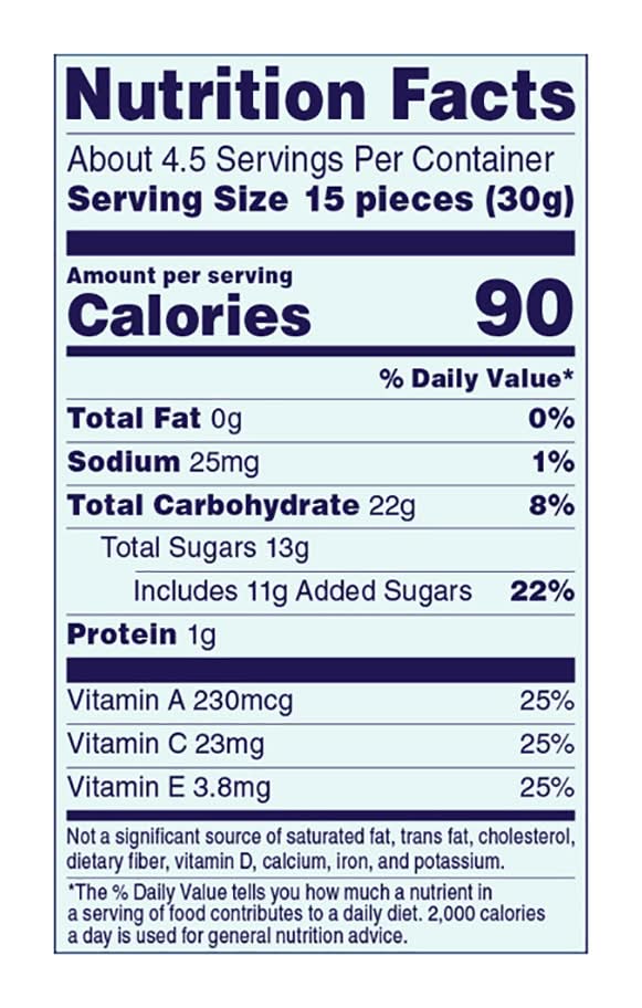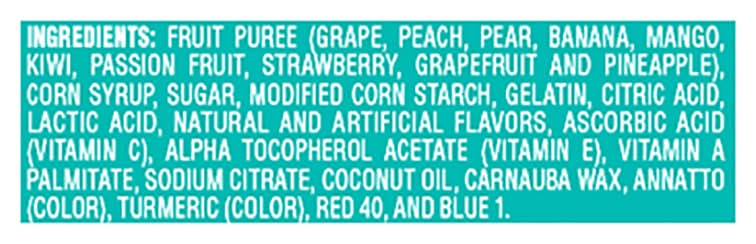Ingredients: Fruit Puree (Grape, Peach, Pear, Banana, Mango, Kiwi, Passion Fruit, Strawberry, Grapefruit and Pineapple), Corn Syrup, Sugar, Modified Corn Starch, Gelatin, Citric Acid, Lactic Acid, Natural and Artificial Flavors, Ascorbic Acid (Vitamin C), Alpha Tocopherol Acetate (Vitamin E), Vitamin A Palmitate, Sodium Citrate, Coconut Oil, Carnauba Wax, Annatto (Color), Turmeric (Color), Red 40, and Blue 1 Contains: Corn, Tree Nuts, Coconuts