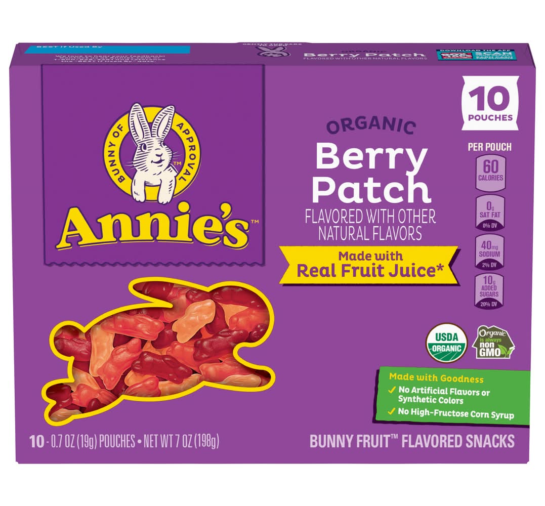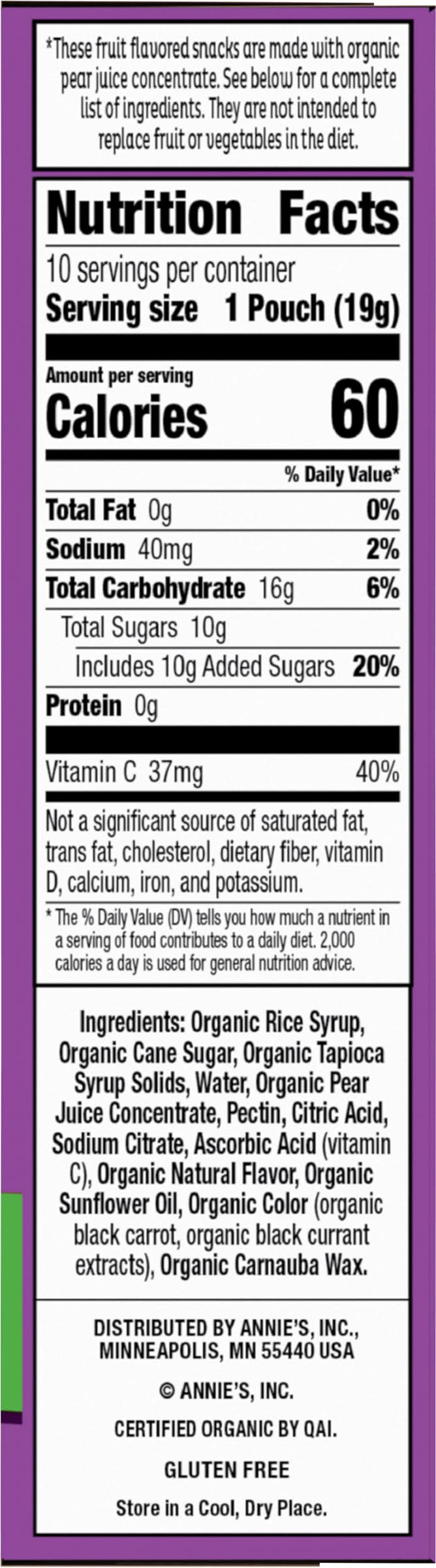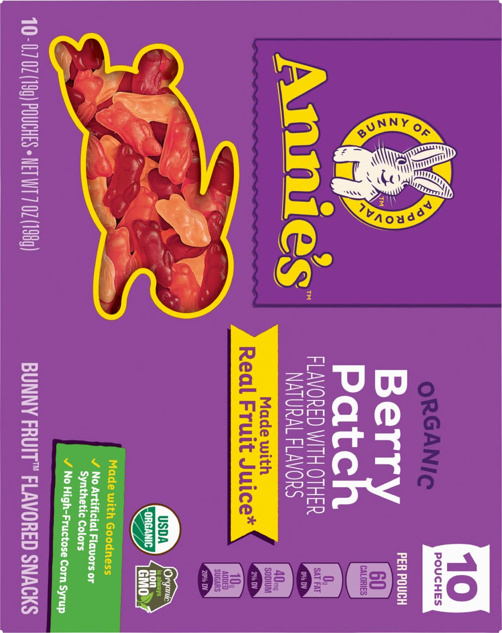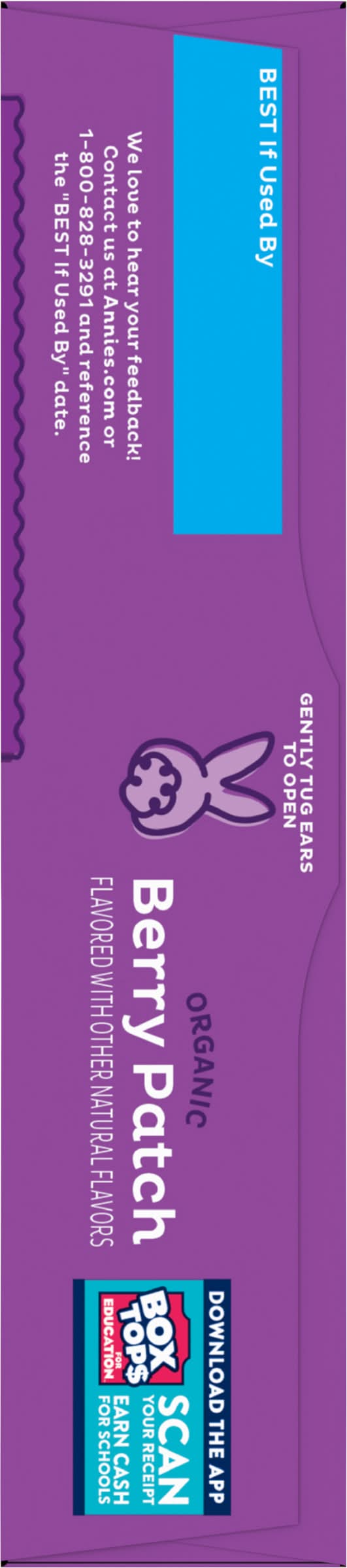 Annie's Organic Berry Patch Bunny Fruit Flavored Snacks are equal parts adorable and delicious! Each fruit flavored snack packs berry flavors into cute, bunny-shaped gummies. These vegan, gelatin free and gluten free snacks turn snack time into bunny fun. These gummies are made with certified organic ingredients and real fruit juice for ultimate wholesome yumminess, and are an excellent source of vitamin C. Every bunny in your family can enjoy the taste of Annie's fruit flavored snacks. from fruit flavored snacks and cereal to mac and cheese. For busy bunnies and families on the go, we help make life a little easier and more delicious by spreading goodness through tasty foods and kindness to the planet. These fruit flavored snacks are made with organic pear juice concentrate. See nutrition panel for a complete list of ingredients. They are not intended to replace fruit or vegetables in the diet. • Flavor: Berry patch • Packaging: Reusable