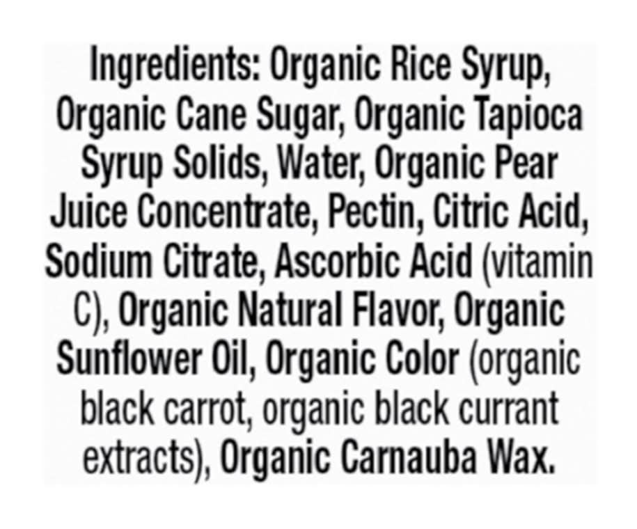 Ingredients: Organic Rice Syrup, Organic Cane Sugar, Organic Tapioca Syrup Solids, Water, Organic Pear Juice Concentrate, Pectin, Citric Acid, Sodium Citrate, Ascorbic Acid (Vitamin C), Organic Natural Flavor, Organic Sunflower Oil, Organic Color (Organic Black Carrot, Organic Black Currant Extracts), Organic Carnauba Wax.