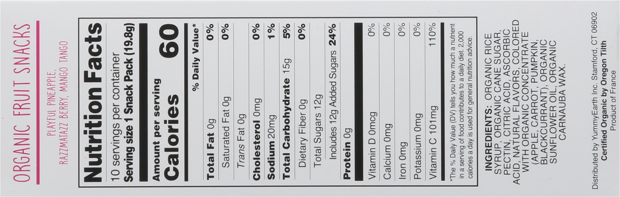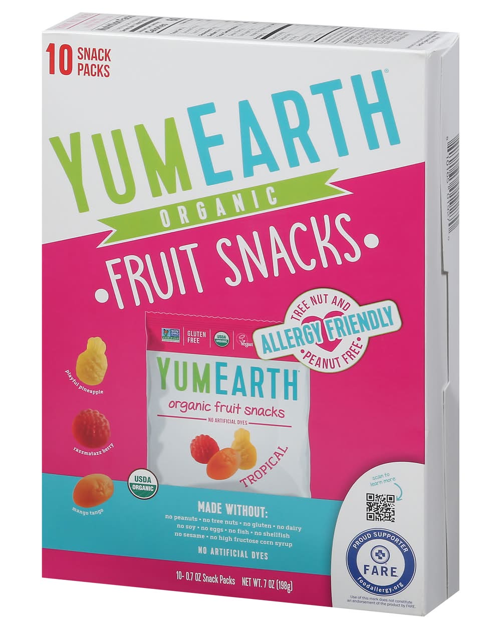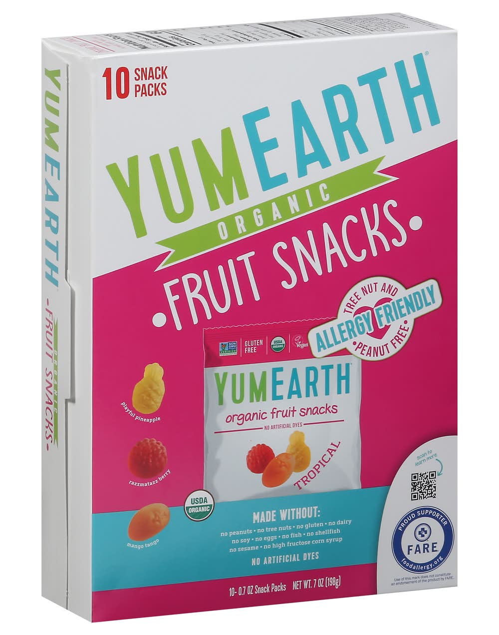 Fruit Snacks, Organic, Tropical, Snack Pack • Flavor: Pineapple-razzmatazzberry-mango • Pack size: 10 • Yummy Earth Inc., CT, 06902