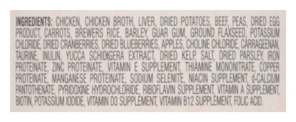 Ingredients: Chicken, Chicken Broth, Liver, Dried Potatoes, Beef Peas, Dried Egg Product, Carrots, Brewers Rice, Barley, Guar Gum, Ground Flaxseed Potassium Chloride, Dried Cranberries, Dried Blueberries, Apples, Choline Chloride, Carrageenan Taurine, Inulin, Yucca Schidigera Extract, Dried Kelp Salt, Dried Parsley Ron Proteinate, Zinc Proteinate, Vitamin E Supplement, Thiamine Mononitrate, Copper Proteinate, Manganese Proteinate, Sodium Selenite, Niacin Supplement, D-Calcium Pantothenate, Pyridoxine Hydrochloride, Riboflavin Supplement, Vitamin A Supplement Biotin, Potassium Iodide, Vitamin D3 Supplement, Vitamin B12 Supplement, Folic Acid Contains: Eggs