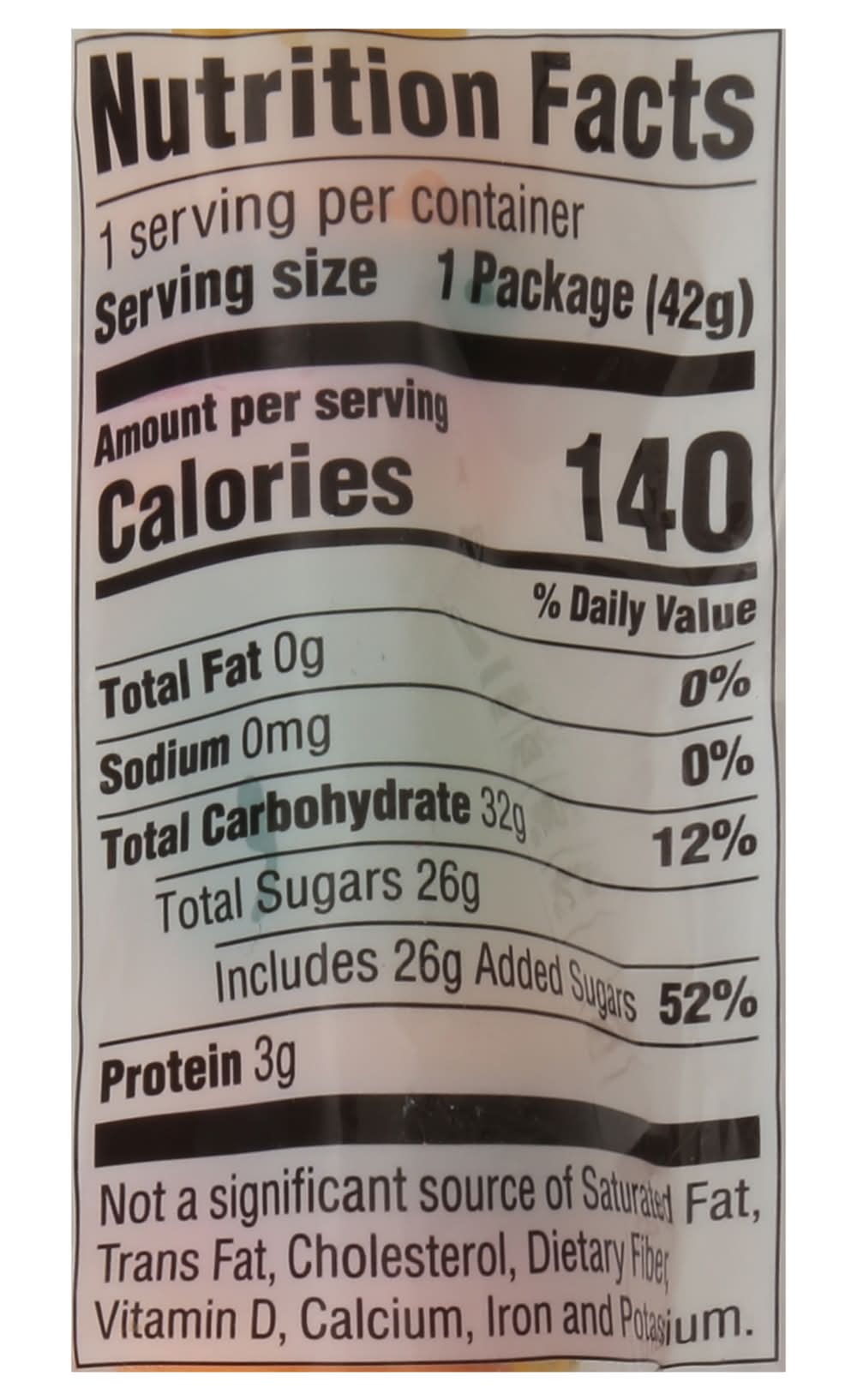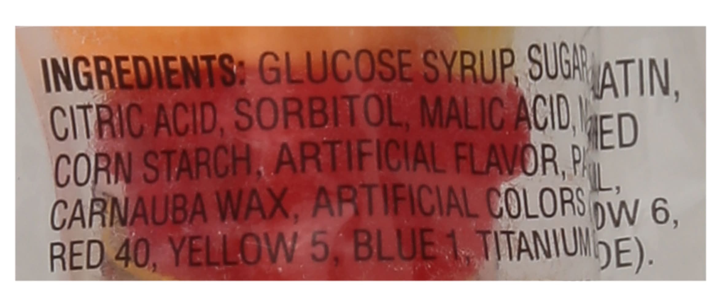 Ingredients: Glucose Syrup, Sugar, Gelatin, Citric Acid, Sorbitol, Malic Acid, Modified Corn Starch, Artificial Flavor, Palm Oil, Carnauba Wax, Artificial Color, Yellow 6, Red 40, Yellow 5, Blue 1, Titanium Dioxide