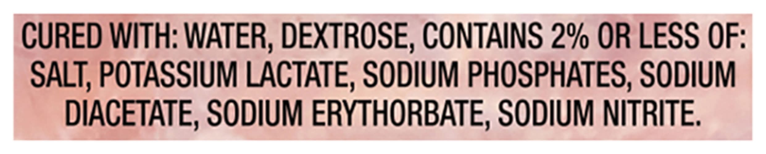 Ingredients: Cured with: Water, Dextrose, Contains 2% or Less of: Salt, Potassium Lactate, Sodium Phosphates, Sodium Diacetate, Sodium Erythorbate, Sodium Nitrite