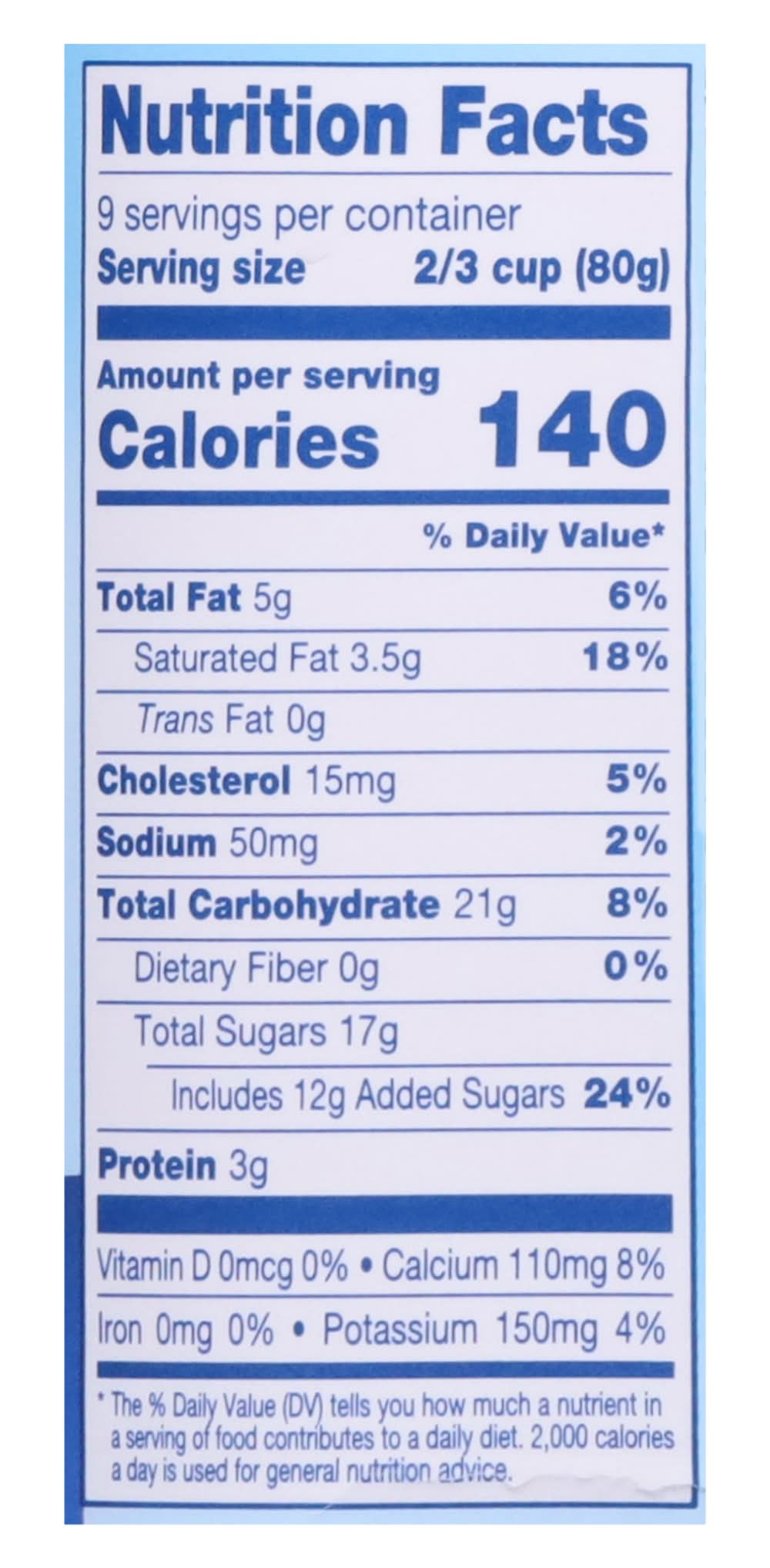 Ingredients: Skim Milk, Sugar, Whey, Corn Syrup, Cream, Buttermilk, Coconut Oil, Fructose, Milk, Contains 1% or less of Egg Yolks, Artificial and Natural Flavor, Mono and Diglycerides, Carob Bean Gum, Cellulose Gum, Cellulose Gel, Carrageenan, Tara Gum, Xanthan Gum, Guar Gum, Maltodextrin, Salt, Polysorbate 80, Caramel Color, Annatto Extract for Color. Contains: Contains Egg, Milk.