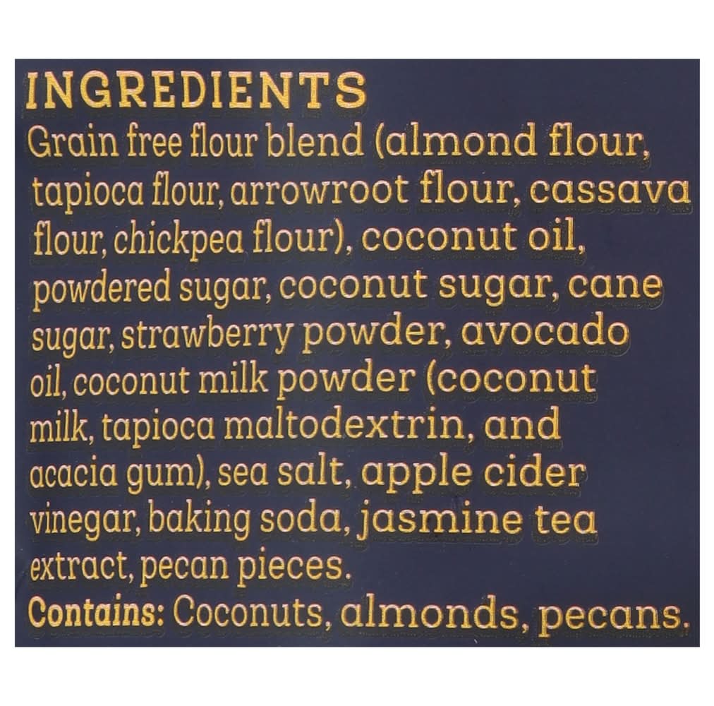 Ingredients: Grain Free Flour Blend (Almond Flour, Tapioca Flour, Arrowroot Flour, Cassava Flour, Chickpea Flour), Coconut Oil, Powdered Sugar, Coconut Sugar, Cane Sugar, Strawberry Powder, Avocado Oil, Coconut Milk Powder (Coconut Milk, Tapioca Maltodextrin, and Acacia Gum), Sea Salt, Apple Cider Vinegar, Baking Soda, Jasmine Tea Extract, Pecan Pieces Contains: Tree Nuts, Coconuts, Tree Nuts, Almonds, Tree Nuts, Pecans