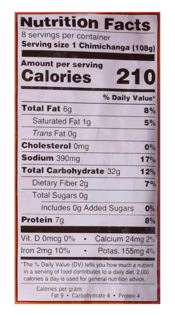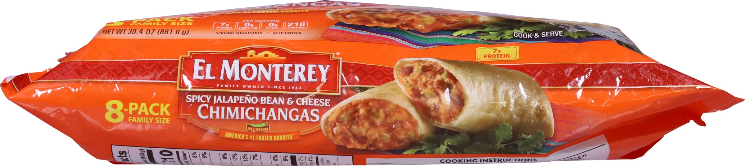 Directions for use: Cooking Instructions: Microwave (1,100 watt microwave): Setting: High. Place 1 chimichanga on microwave safe plate. Frozen: 1 minute 15 seconds. Let product stand 30 seconds before eating. Oven: Preheat oven to 350 degrees F. Place chimichanga on baking sheet with 1 inch between chimichangas. Bake uncovered. Frozen: 29 minutes. Let product stand 2 minutes before eating. Air Fryer: 380 degrees F. Place 2 chimichangas in air fryer basket. Frozen: Cook for 6 minutes, flip and cook for additional 6 minutes. Let product stand 1 minute before eating. For food safety and quality, internal product temperature must reach 165 degrees F. Since ovens vary, cooking times may require adjusting. Caution: Product may be hot. Keep frozen. Storage recommendation: Keep frozen.