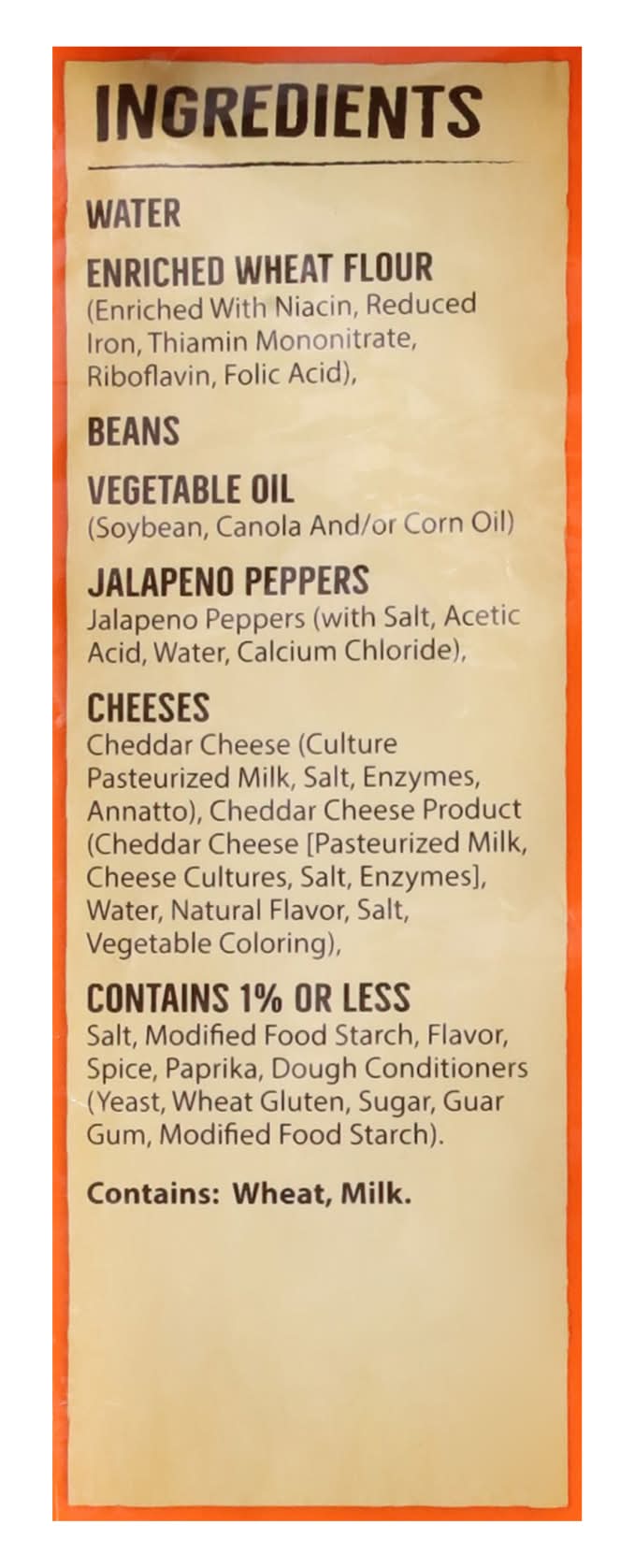 Ingredients: Water, Enriched Wheat Flour (Enriched with Niacin, Reduced Iron, Thiamin Mononitrate, Riboflavin, Folic Acid), Beans Vegetable Oil (Soybean, Canola and/or Corn Oil) Jalapeno Peppers Jalapeno Peppers (with Salt, Acetic Acid, Water, Calcium Chloride), Cheeses Cheddar Cheese (Culture Pasteurized Milk, Salt, Enzymes, Annatto), Cheddar Cheese Product (Cheddar Cheese [Pasteurized Milk, Cheese Cultures, Salt, Enzymes], Water, Natural Flavor, Salt, Vegetable Coloring), Contains 1% or Less Salt, Modified Food Starch, Flavor, Spice, Paprika, Dough Conditioners (Yeast, Wheat Gluten, Sugar, Guar Gum, Modified Food Starch) Contains: Wheat, Milk, Corn, Gluten