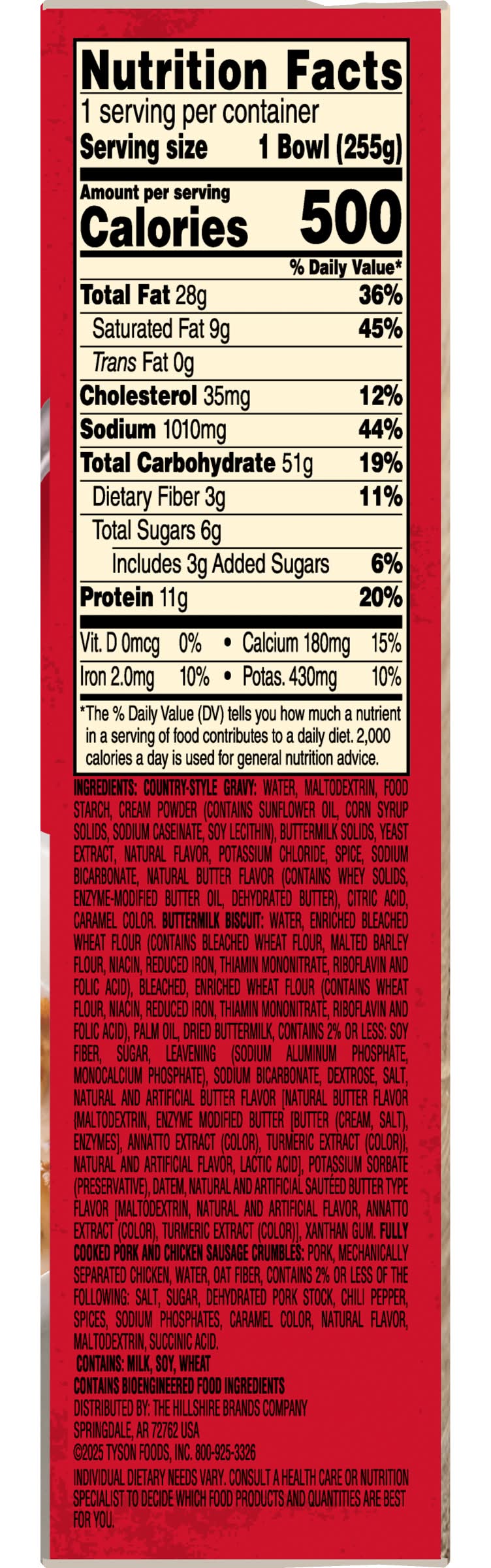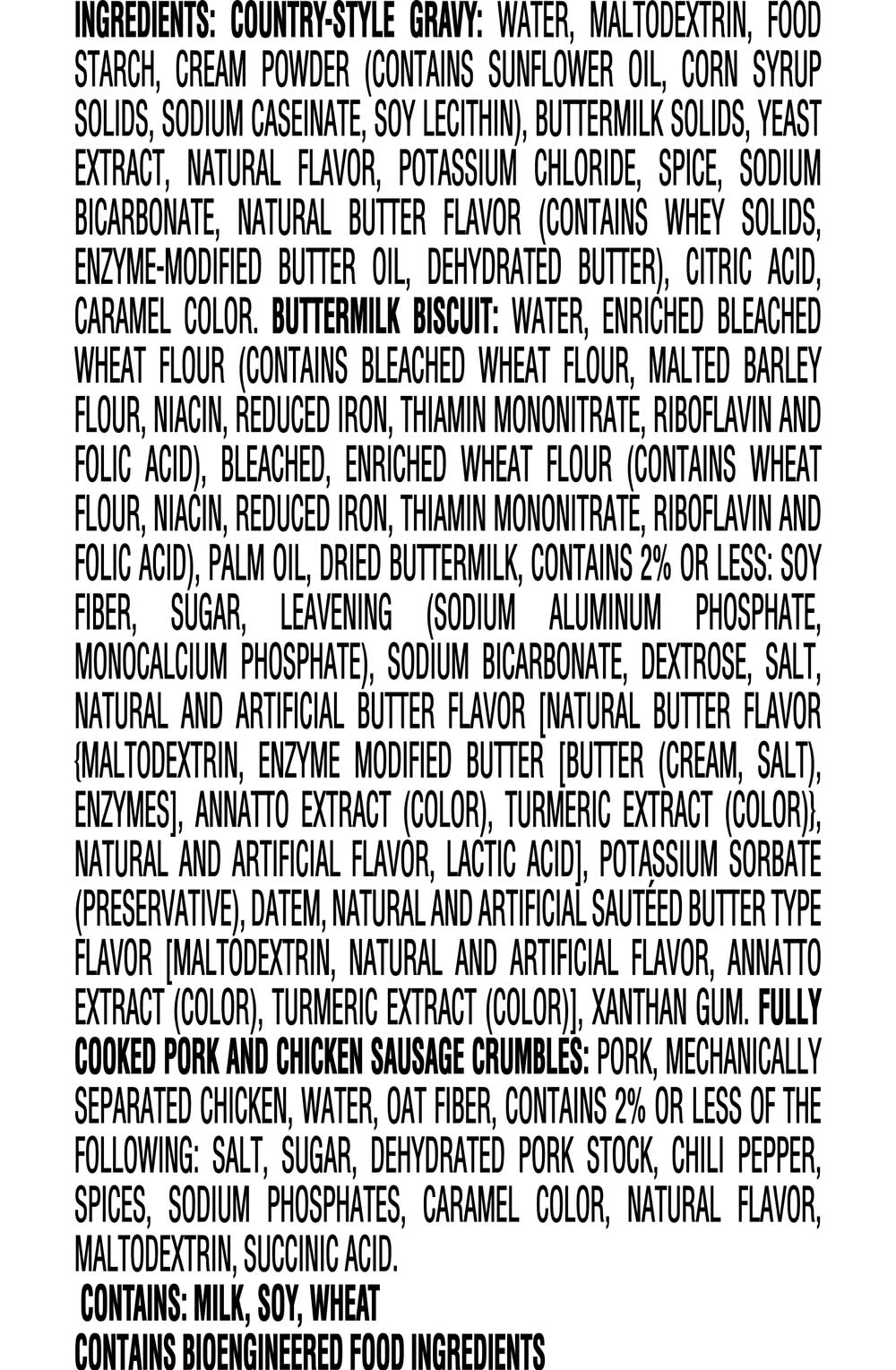 Ingredients: Country-Style Gravy: Water, Maltodextrin, Food Starch, Cream Powder (Contains Sunflower Oil, Corn Syrup Solids, Sodium Caseinate, Soy Lecithin), Buttermilk Solids, Yeast Extract, Natural Flavor, Potassium Chloride, Spice, Sodium Bicarbonate, Natural Butter Flavor (Contains Whey Solids, Enzyme-Modified Butter Oil, Dehydrated Butter), Citric Acid, Caramel Color. Buttermilk Biscuit: Water, Enriched Bleached Wheat Flour (Contains Bleached Wheat Flour, Malted Barley Flour, Niacin, Reduced Iron, Thiamin Mononitrate, Riboflavin And Folic Acid), Bleached, Enriched Wheat Flour (Contains Wheat Flour, Niacin, Reduced Iron, Thiamin Mononitrate, Riboflavin And Folic Acid), Palm Oil, Dried Buttermilk, Contains 2% Or Less: Soy Fiber, Sugar, Leavening (Sodium Aluminum Phosphate, Monocalcium Phosphate), Sodium Bicarbonate, Dextrose, Salt, Natural And Artificial Butter Flavor [Natural Butter Flavor {Maltodextrin, Enzyme Modified Butter [Butter (Cream, Salt), Enzymes], Annatto Extract (Color), Turmeric Extract (Color)}, Natural And Artificial Flavor, Lactic Acid], Potassium Sorbate (Preservative), DATEM, Natural And Artificial Sautéed Butter Type Flavor [Maltodextrin, Natural And Artificial Flavor, Annatto Extract (Color), Turmeric Extract (Color)], Xanthan Gum. Fully Cooked Pork And Chicken Sausage Crumbles: Pork, Mechanically Separated Chicken, Water, Oat Fiber, Contains 2% Or Less Of The Following: Salt, Sugar, Dehydrated Pork Stock, Chili Pepper, Spices, Sodium Phosphates, Caramel Color, Natural Flavor, Maltodextrin, Succinic Acid. Contains: Milk, Soy, Wheat