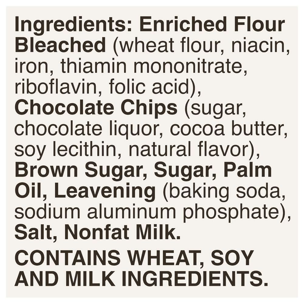 Ingredients: Enriched Flour Bleached (Wheat Flour, Niacin, Iron, Thiamin Mononitrate, Riboflavin, Folic Acid), Chocolate Chips (Sugar, Chocolate Liquor, Cocoa Butter, Soy Lecithin, Natural Flavor), Brown Sugar, Sugar, Palm Oil, Leavening (Baking Soda, Sodium Aluminum Phosphate), Salt, Nonfat Milk. Contains: Wheat, Soybeans, Milk, Egg