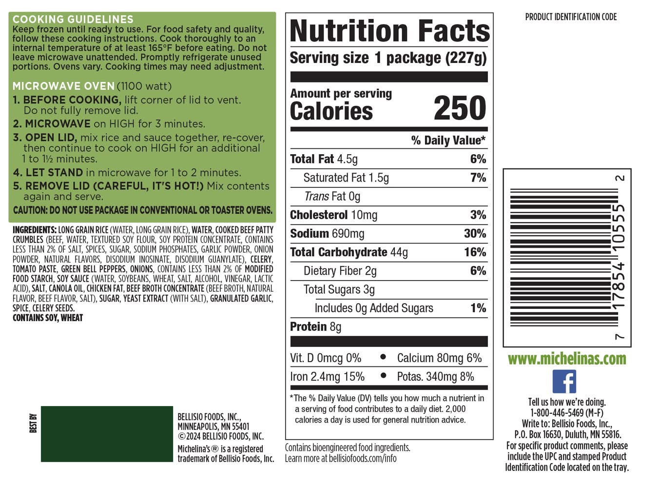 Ingredients: Cooked Rice, Water, Cooked Beef Patty Crumble (Beef, Water, Soy Sauce Powder [Soy Sauce {Fermented Soybeans, Wheat, Salt}, Maltodextrin, Salt), Textured Vegetable Protein [Soy Flour, Caramel Color], Isolated Soy Protein, Modified Food Starch, Dehydrated Minced Onions, Salt, Sugar, Sodium Tripolyphosphate, Flavoring [Maltodextrin and Natural Flavor], Wheat Gluten, Celery Seeds), Celery, Tomato Paste, Green Bell Peppers, Onions, Contains Less than 2% of Modified Food Starch, Soy Sauce (Water, Soybeans, Wheat, Salt, Alcohol, Vinegar, Lactic Acid), Salt, Canola Oil, Chicken Fat, Beef Broth Flavor (Beef Broth, Natural Flavor, Beef Flavor, Salt), Sugar, Yeast Extract, Granulated Garlic, Spice, Celery Seeds. Contains: Soy, Wheat