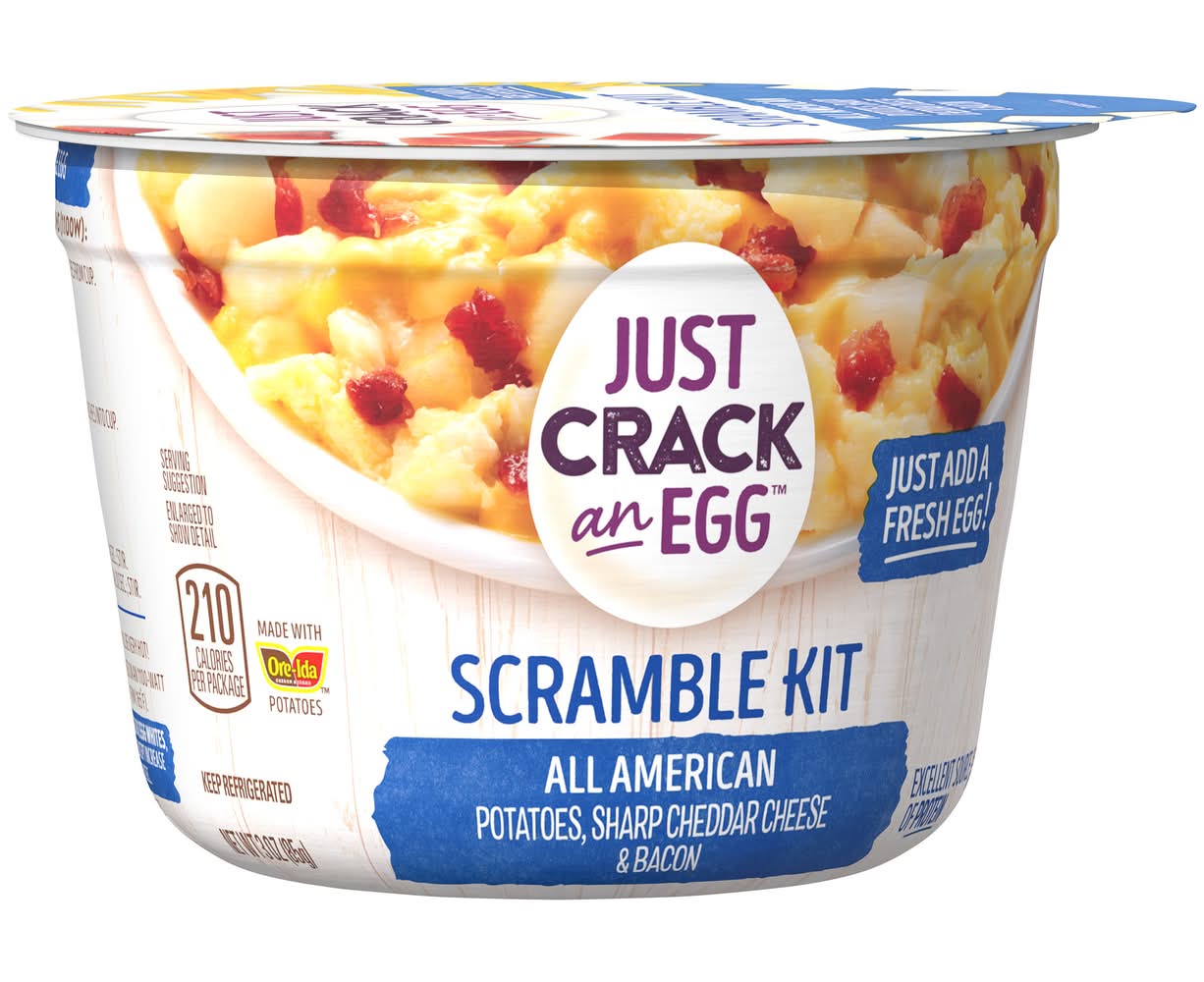 Ready in less than two minutes, our Just Crack an Egg All American Scramble Breakfast Bowl Kit is made with diced Ore-Ida potatoes, sharp cheddar cheese and uncured bacon. Simply add a fresh egg, stir the ingredients and microwave for a quick and easy bowl at home or on the go. Try preparing yours with two eggs for a heartier option. Our scrambled egg cups can also be made with egg whites. The all American scramble breakfast bowl kit is an excellent source of protein to start the day off right. Keep the breakfast bowl kits refrigerated until you’re ready to prepare. • Flavor: All american • Kraft Heinz Foods Company, Pittsburgh, PA, 15222