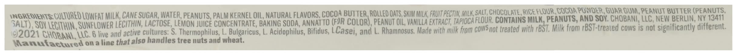 Ingredients: Cultured Lowfat Milk, Cane Sugar, Water, Peanuts, Cocoa Butter, Milk, Chocolate, Palm Kernel Oil, Natural Flavors, Rolled Oats, Rice Flour, Fruit Pectin, Cocoa Powder, Salt, Soy Lecithin, Guar Gum, Skim Milk, Peanut Butter (Peanuts, Salt), Lactose, Lemon Juice Concentrate, Vanilla Extract, Annatto (for Color). 6 Live and Active Cultures: S. Thermophilus, L. Bulgaricus, L. Acidophilus, Bifidus, L. Casei, and L. Rhamnosus Contains: Milk, Peanuts, Oat, Soybeans, Lactose, Tree Nuts, Wheat