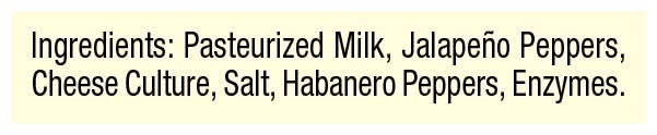 Ingredients: Pasteurized Milk, Jalapeno Peppers, Cheese Culture, Salt, Habanero Peppers, Enzymes. Contains: Milk Contains'