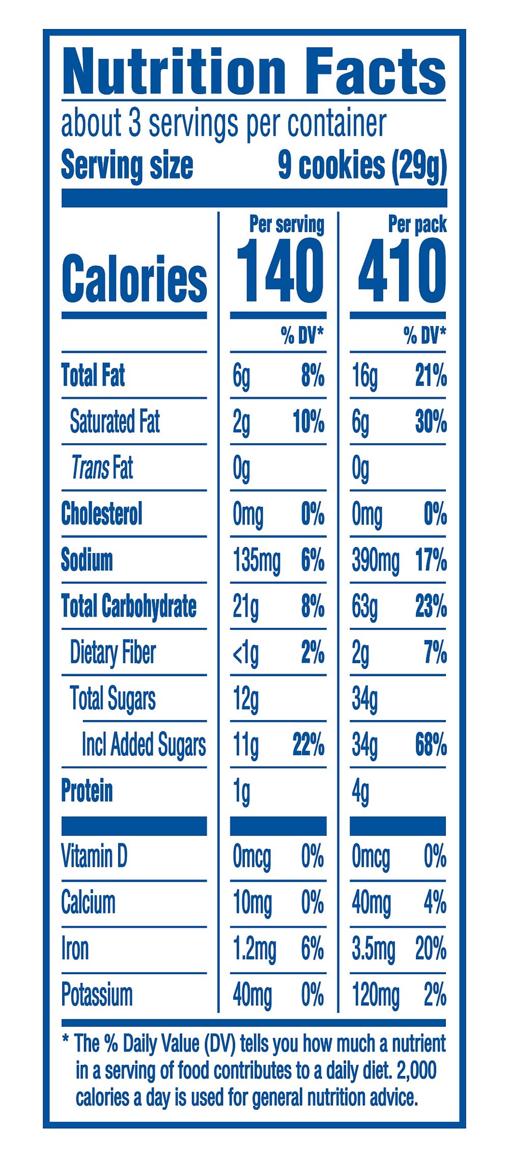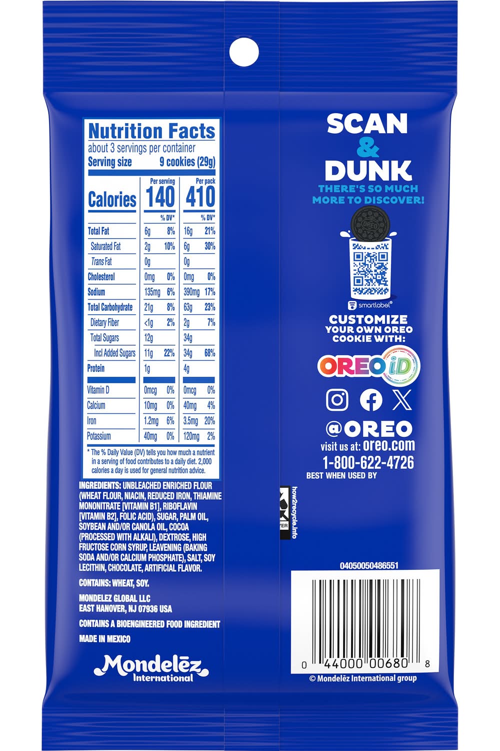 offer a delightful snack with each serving of nine cookies containing. Approximately three servings are included per bag. These cookies are made with sustainably sourced cocoa through a partnership with Cocoa Life to support sustainable cocoa sourcing practices. They are produced in Mexico and contain a bioengineered food ingredient. Mondelez Global LLC, East Hanover,NJ,07936