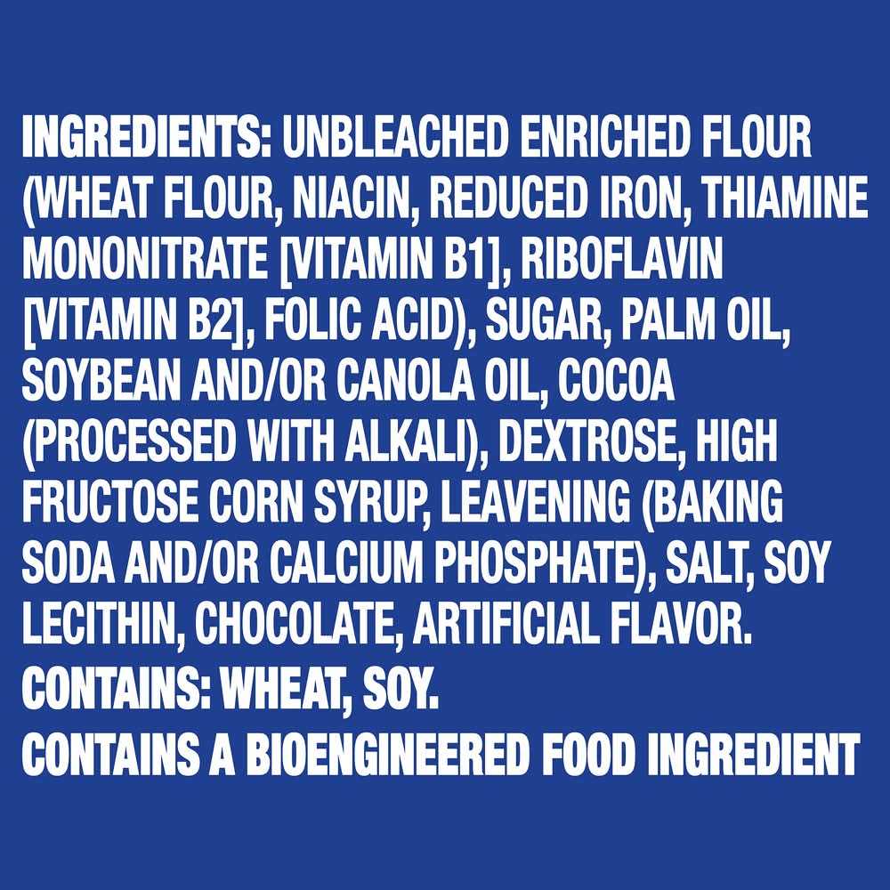 Ingredients: Ingredients: Unbleached Enriched Flour (Wheat Flour Niacin Reduced Iron Thiamine Mononitrate [Vitamin B1] Riboflavin [Vitamin B2] Folic Acid) Sugar Palm Oil Soybean And/Or Canola Oil Cocoa (Processed With Alkali) Dextrose High Fructose Corn Syrup Leavening (Baking Soda And/Or Calcium Phosphate) Salt Soy Lecithin Chocolate Artificial Flavor. Contains: Wheat Soy. Contains: Wheat, Soy