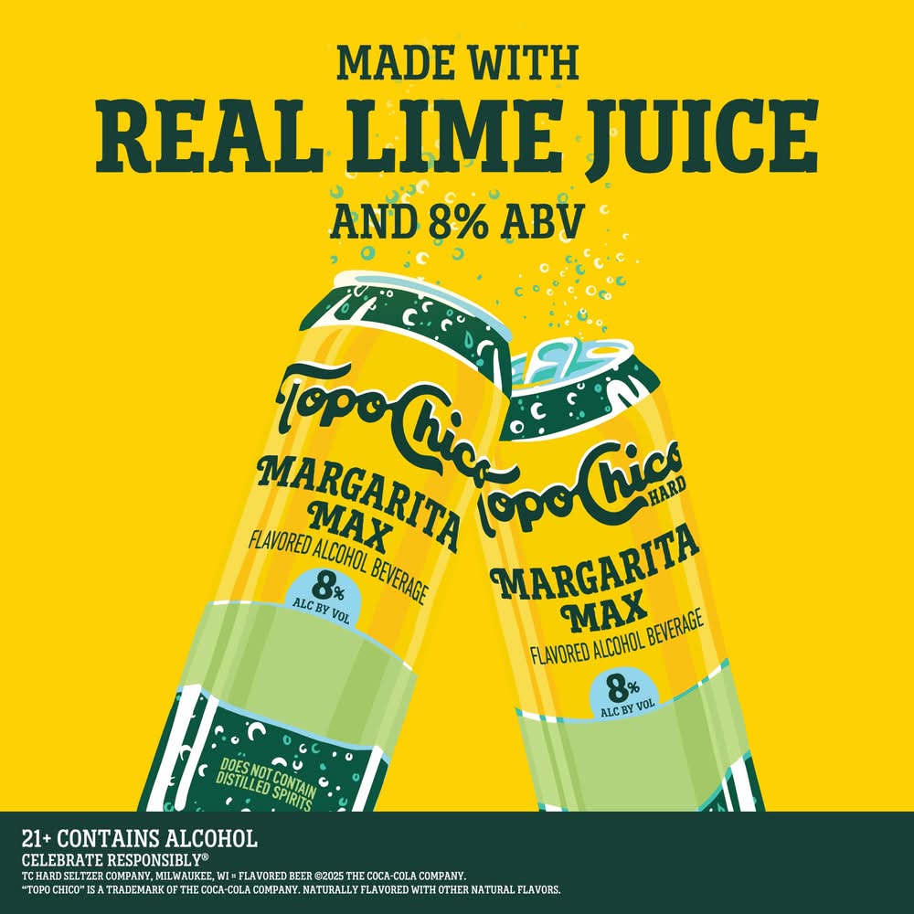 Enjoy a delicious spiked beverage inspired by classic margarita cocktails. Topo Chico Hard Margarita MAX is a bold, flavored alcohol beverage with a higher 8.0% ABV. Our Signature Margarita combines lime and tequila flavors with added minerals for a crisp taste that's sure to become one of your favorites. This canned margarita is made with real lime juice and provides a bolder offering from our Topo Chico Hard Margarita lineup. Perfect for barbecues, happy hours or hanging out with friends, pick up a refreshing 16.0 fl oz cans, and enjoy with your favorite snacks and meals or all by itself. Hello refreshment! Hello Topo Chico Hard! Alcohol by volume: 8%