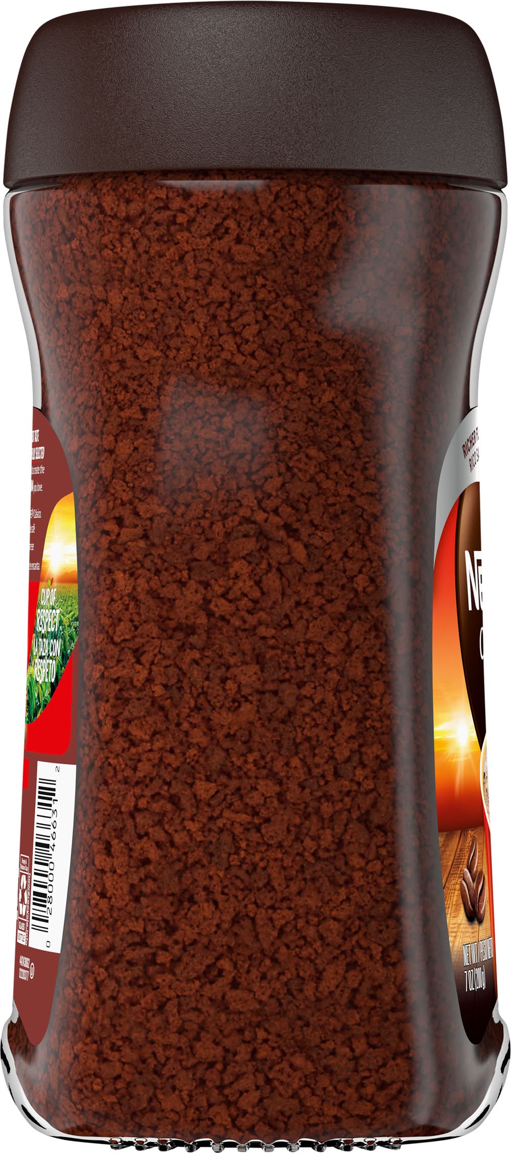Nescafé Clasico is made from 100% pure coffee, crafted to deliver a rich, bold flavor and aroma. Prepared with 6 fl oz per cup, it provides up to 100 cups. The coffee beans are carefully selected and expertly roasted to ensure a satisfying taste, supporting Nescafé’s responsible sourcing practices. • Brand: Nescafé • Size: 200 • kosher • Nestle USA, inc., Arlington, Va, 22209. • Packaging: Reusable