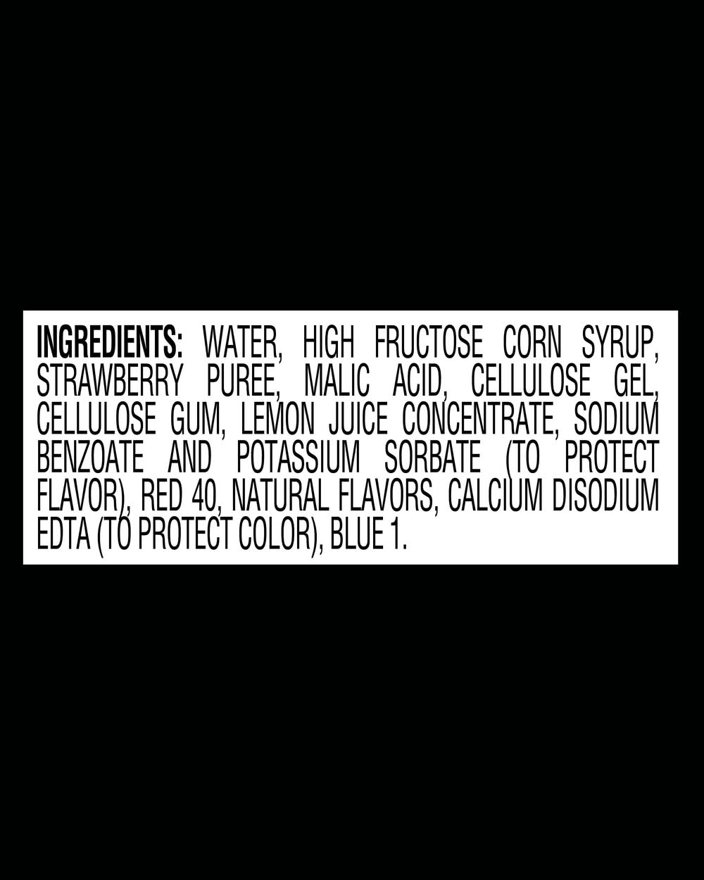 Ingredients: Water, High Fructose Corn Syrup, Strawberry Puree Concentrate, Malic Acid, Cellulose Gel, Cellulose Gum, Lemon Juice Concentrate, Sodium Benzoate and Potassium Sorbate (to Protect Flavor), Natural Flavors, Red 40, Calcium Disodium EDTA (to Protect Flavor), Blue 1.