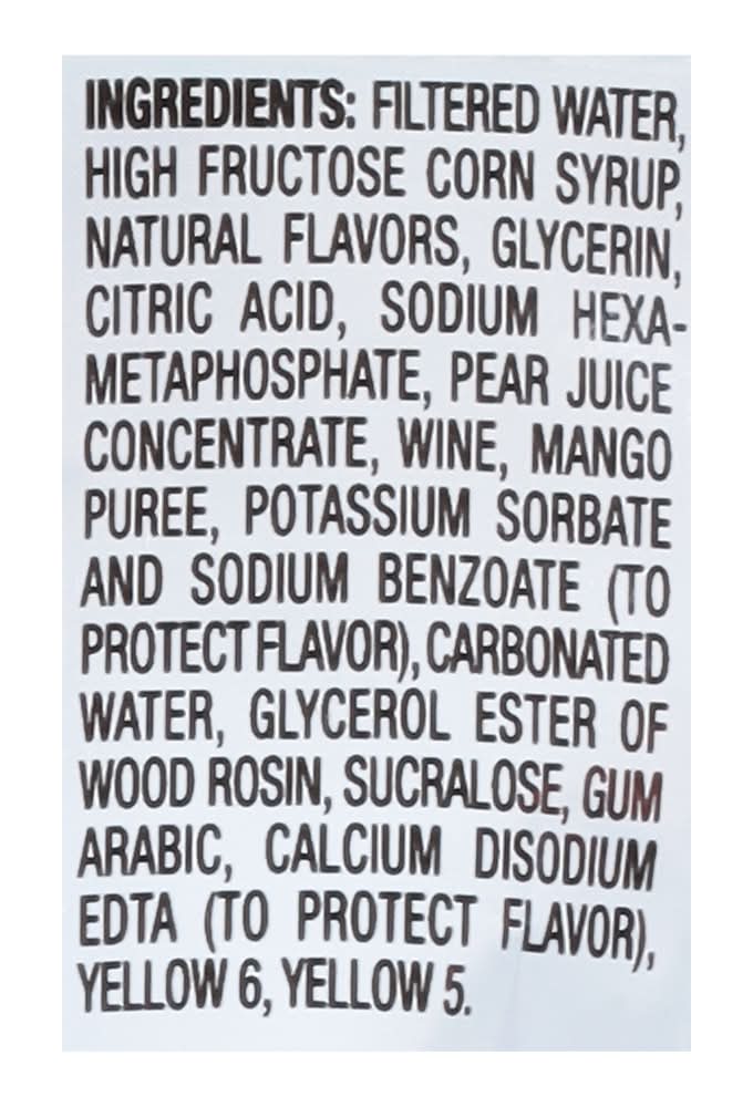 Ingredients: Filtered Water, High Fructose Corn Syrup, Natural Flavors, Glycerin, Citric Acid, Sodium Hexametaphosphate, Pear Juice Concentrate, Wine, Mango Puree, Potassium Sorbate and Sodium Benzoate (to Protect Flavor), Carbonated Water, Glycerol Ester of Wood Rosin, Sucralose, Gum Arabic, Calcium Disodium EDTA (to Protect Flavor), Yellow 6, Yellow 5.