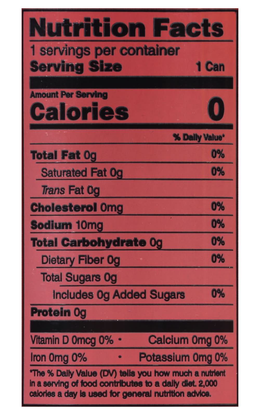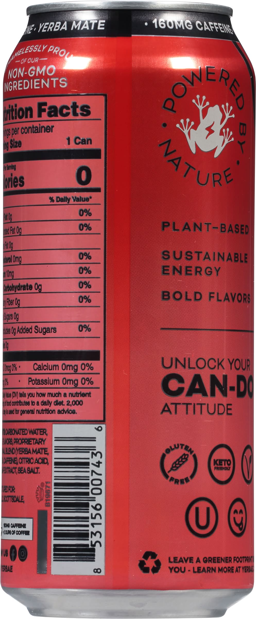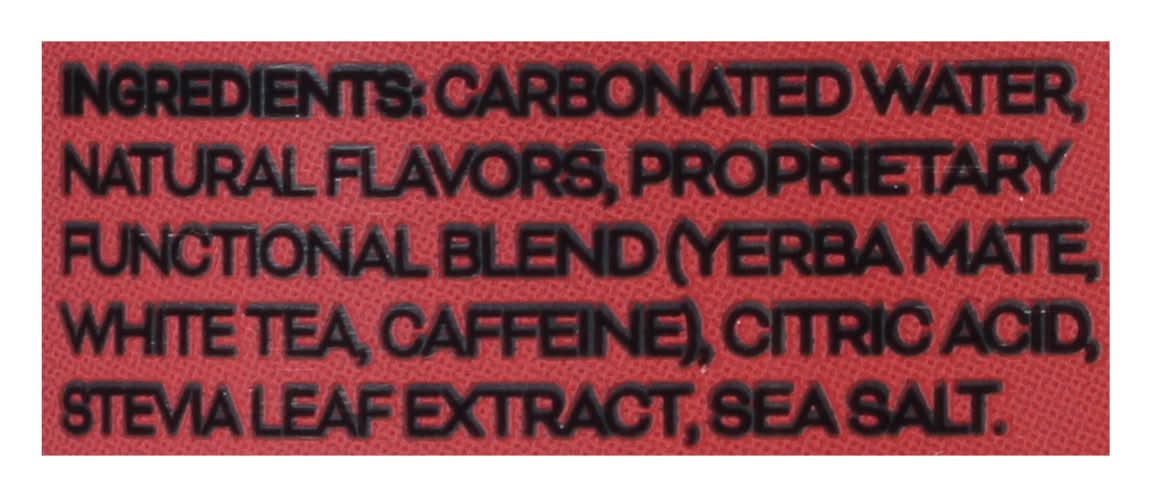 Ingredients: Carbonated Water, Natural Flavors, Proprietary Functional Blend (Yerba Mate, White Tea, Caffeine), Citric Acid, Stevia Leaf Extract, Sea Salt