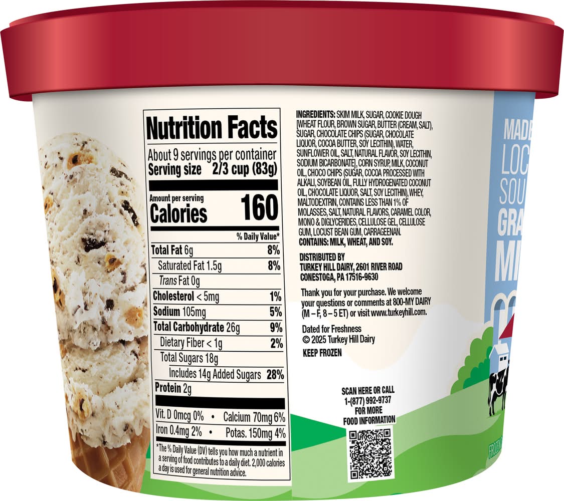 Ingredients: Skim Milk, Sugar, Cookie Dough [Wheat Flour, Brown Sugar, Butter (Cream, Salt), Sugar, Chocolate Chips (Sugar, Chocolate Liquor, Cocoa Butter, Soy Lecithin), Water, Sunflower Oil, Salt, Natural Flavor, Soy Lecithin, Sodium Bicarbonate, Corn Syrup, Milk, Coconut Oil, Choco Chips (Sugar, Cocoa Processed with Alkali, Soybean Oil, Fully Hydrogenated Coconut Oil, Chocolate Liquor, Salt, Soy Lecithin), Whey, Maltodextrin, Contains Less than 1% of Molasses, Salt, Natural Flavors, Caramel Color, Mono&Diglycerides, Cellulose Gel, Cellulose Gum, Locust Bean Gum, Carrageenan Contains: Milk, Wheat, Soybeans