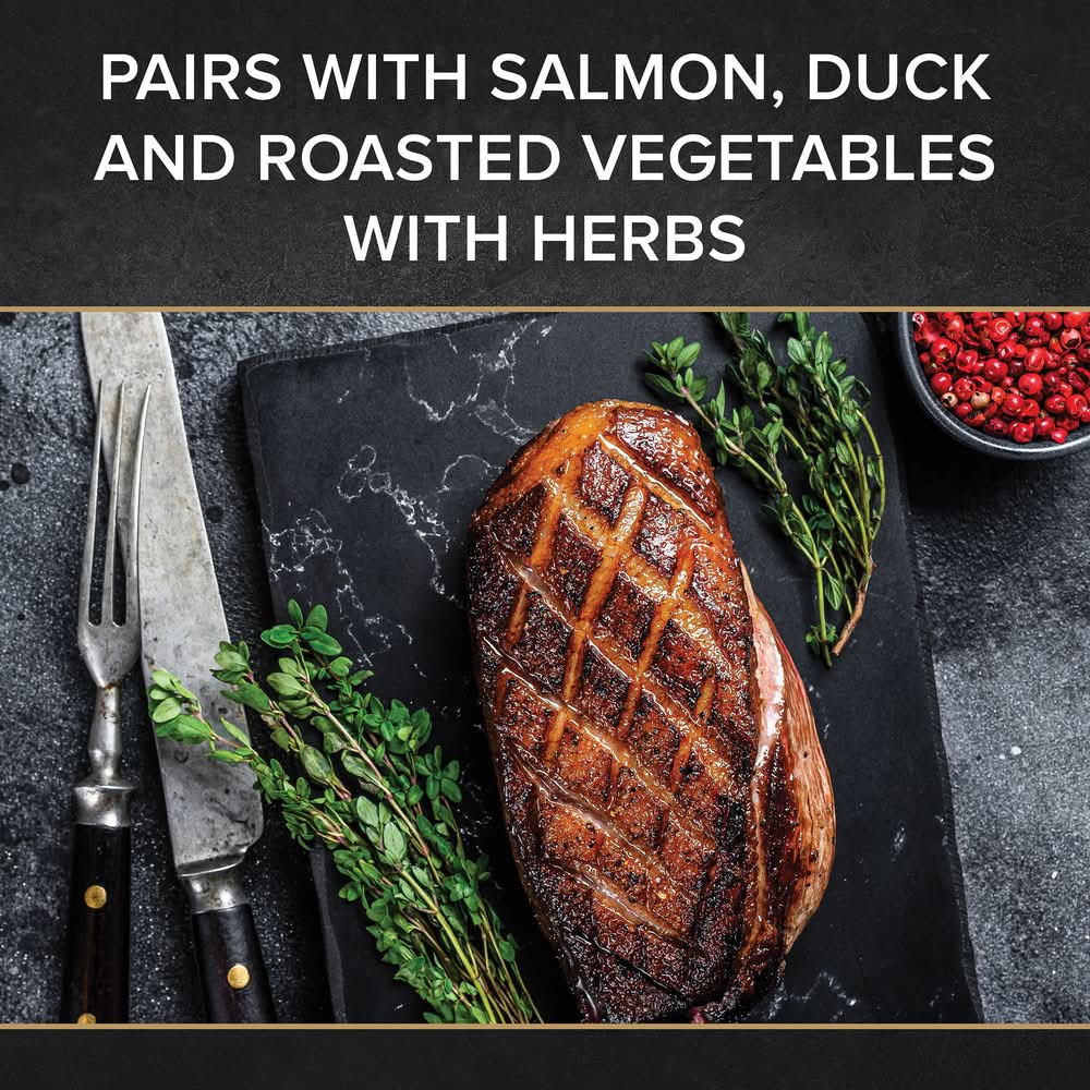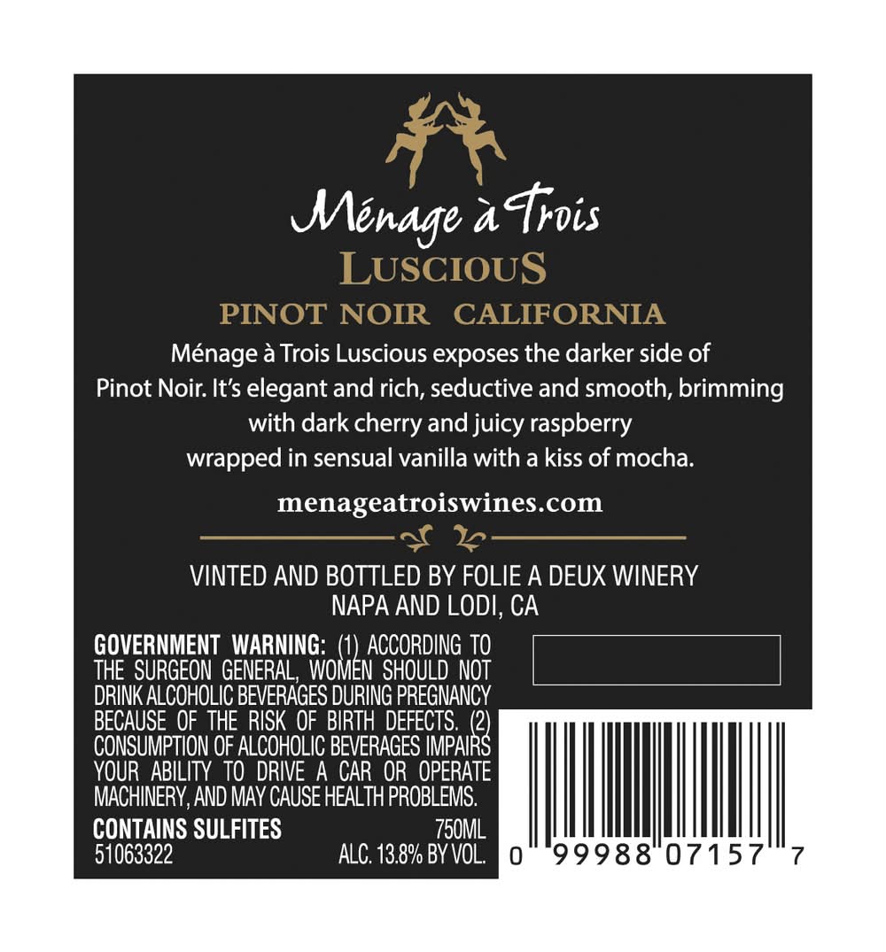 Menage a Trois Luscious Pinot Noir exposes the darker side of red wine with deep, seductive results. Soft and approachable, this dry red wine features succulent black cherry and rich raspberry flavors that flirt dangerously with sensual whispers of vanilla, thrilling your palate. This California red wine seduces you with its sultry fragrance, voluptuous flavors and smooth finish. The 2020 vintage received 91 points at the 2023 Toast of the Coast. This dark, sultry Pinot Noir red wine is the ideal complement for salmon filets, duck and roasted vegetables with herbs. California wine made with grapes sourced from premier California vineyards. During the wine making process, this bottled wine is aged in French and American oak to enhance the fruit flavors with smooth, rounded tannins. This bottled wine has 13.7% alcohol by volume. Menage a Trois offers a robust portfolio of award-winning wines that consistently delight with a high-quality experience. • Alcohol by volume: 13.8% • 0