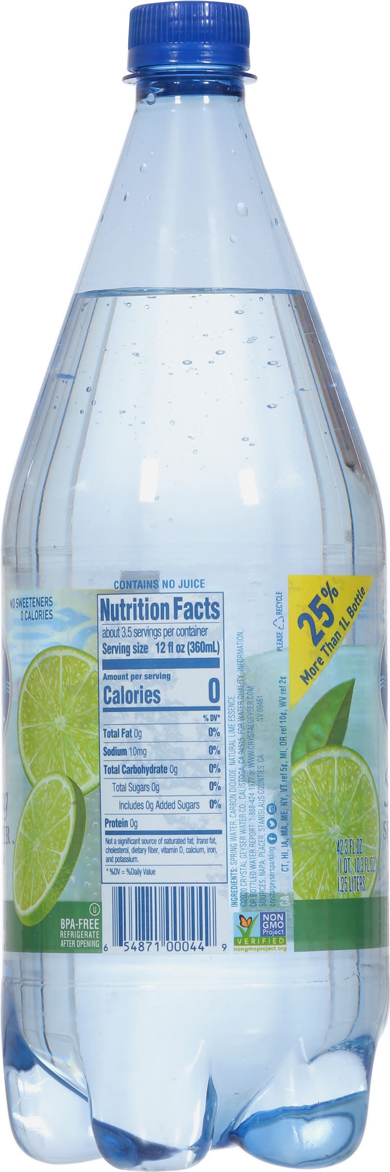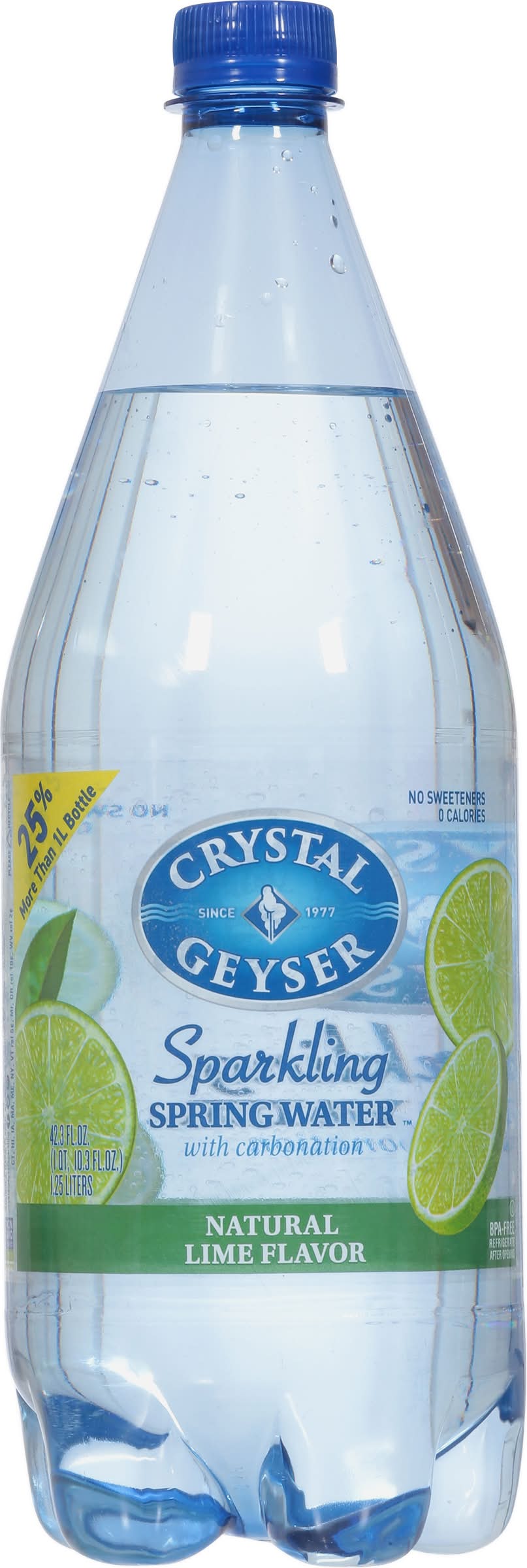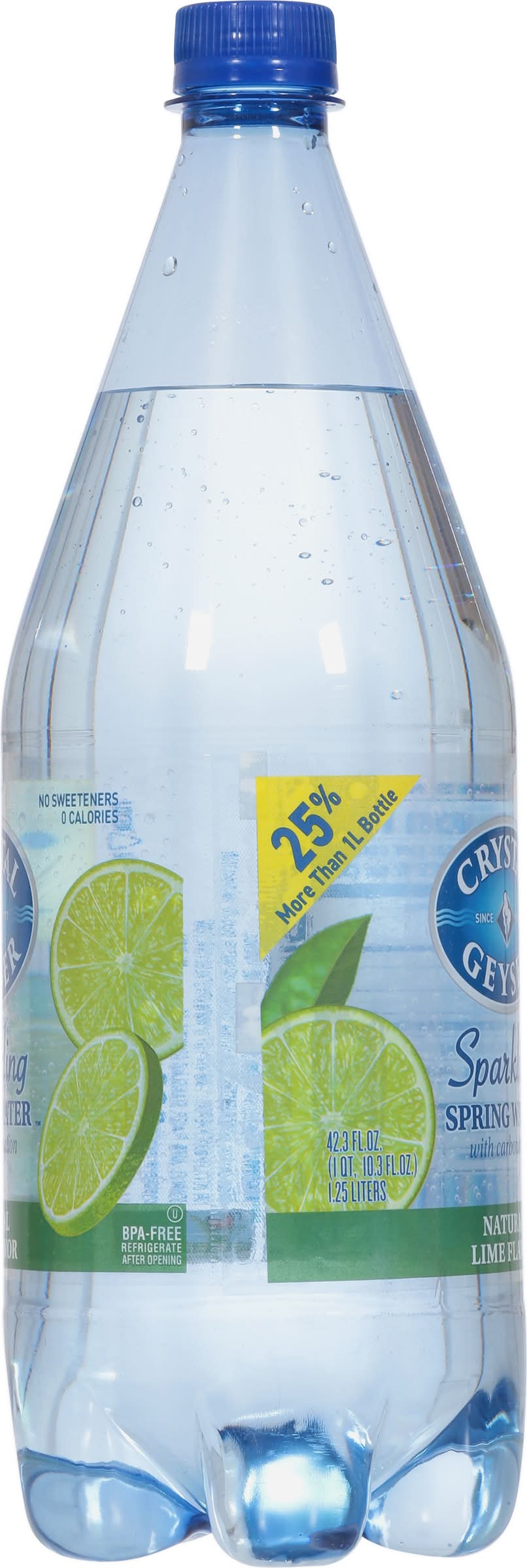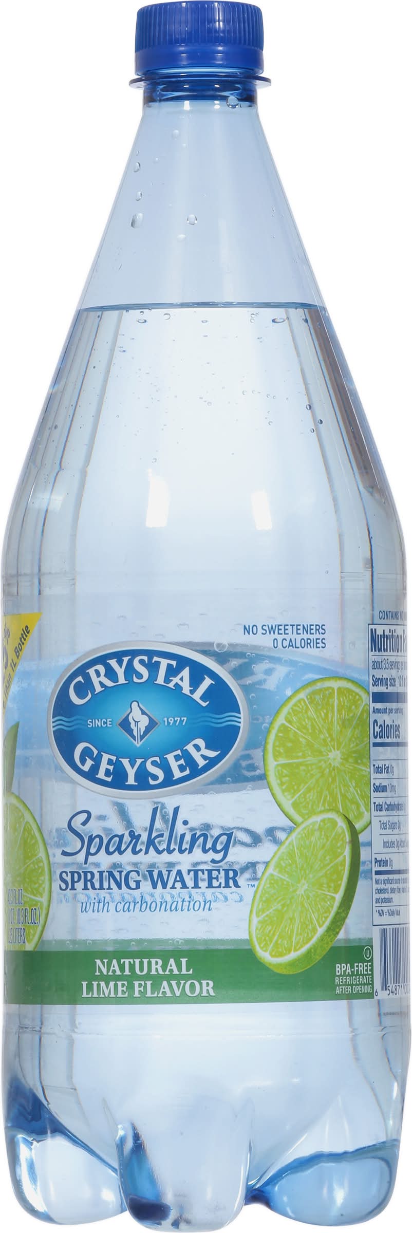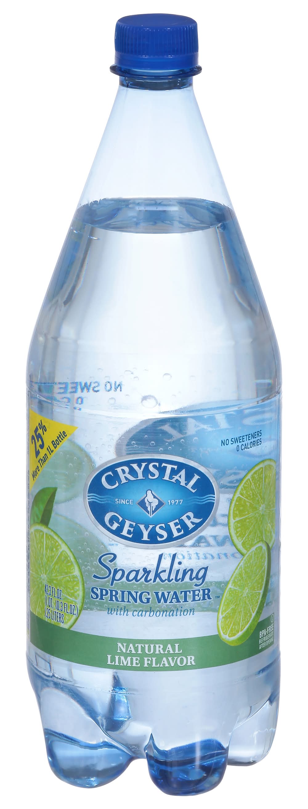 Spring Water, Sparkling, Natural Lime Flavor • Brand: Crystal geyser • kosher, GMO-free, • Crystal Geyser Water Co., Calistoga, CA, 94515 • Packaging: Reusable