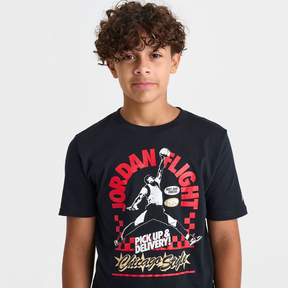 Size & Fit Standard fit is relaxed Product Features Essential athleisure tee with 1984 Chicago Style pizza shop-inspired MJ graphics printed on front Signature Jumpman logo on left sleeve adds heritage athletic energy Classic crewneck construction Short-sleeve silhouette Material percentages may vary. Check the label for actual content. Machine wash The Jordan Flight Pizza Shop T-Shirt is imported. Keep your outfit looking "hot and fresh" wearing this Kids' Jordan Flight Pizza Shop T-Shirt. This crewneck tee features Chicago-style pizza shop-inspired MJ's graphics on the front and iconic Jumpman branding on the sleeve. | Jordan Big Kids Flight Pizza Shop T-Shirt in Black/Gym Red/White | Size: Small • Color: Black/gym red/white • Size: Small