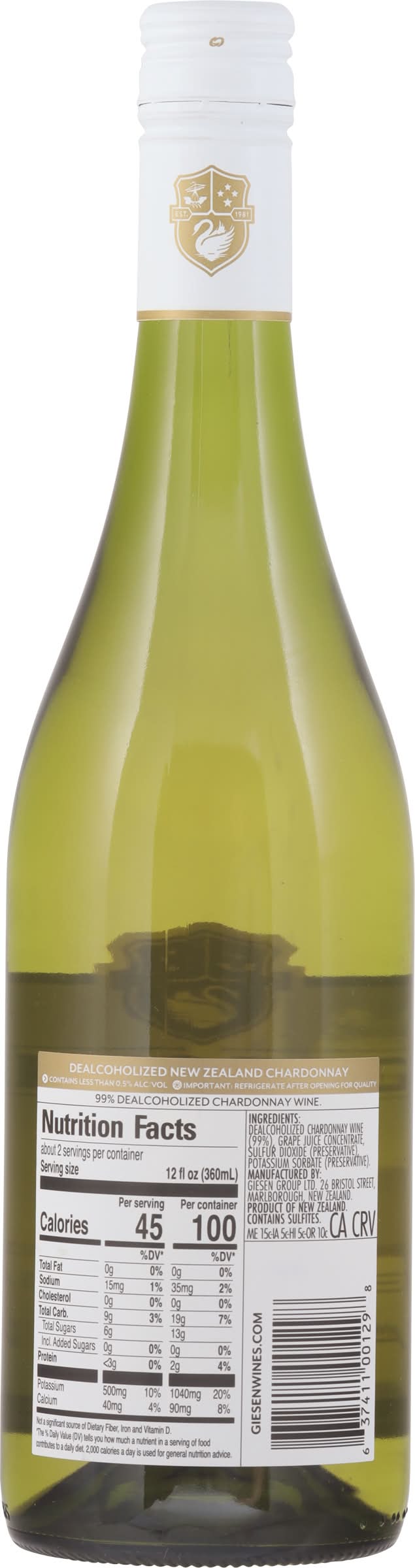 Ingredients: Dealcoholized Chardonnay Wine (99%), Grape Juice Concentrate, Sulfur Dioxide (Preservative), Potassium Sorbate (Preservative) Contains: Sulfites