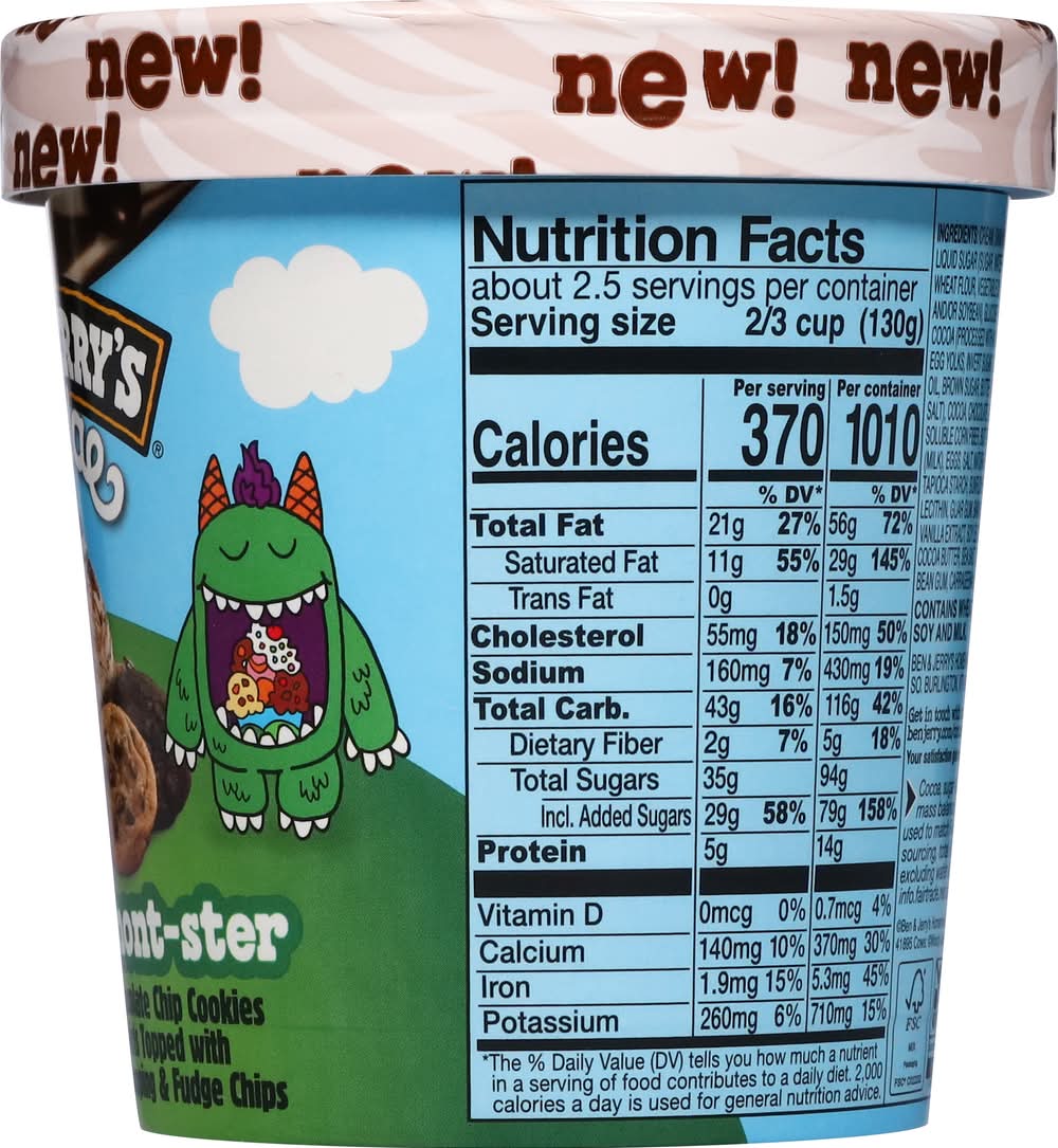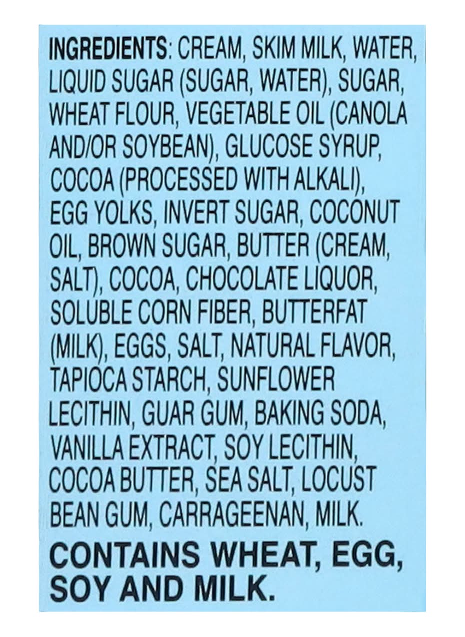 Ingredients: Cream, Skim Milk, Water, Liquid Sugar (Sugar, Water), Sugar, Wheat Flour, Vegetable Oil (Canola and/or Soybean), Glucose Syrup, Cocoa (Processed with Alkali), Egg Yolks, Invert Sugar, Coconut Oil, Brown Sugar, Butter (Cream, Salt), Cocoa, Chocolate Liquor, Soluble Corn Fiber, Butterfat (Milk), Eggs, Salt, Natural Flavor, Tapioca Starch, Sunflower Lecithin, Guar Gum, Baking Soda, Vanilla Extract, Soy Lecithin, Cocoa Butter, Sea Salt, Locust Bean Gum, Carrageenan, Milk Contains: Wheat, Eggs, Soybeans, Milk, Tree Nuts, Coconuts, Corn