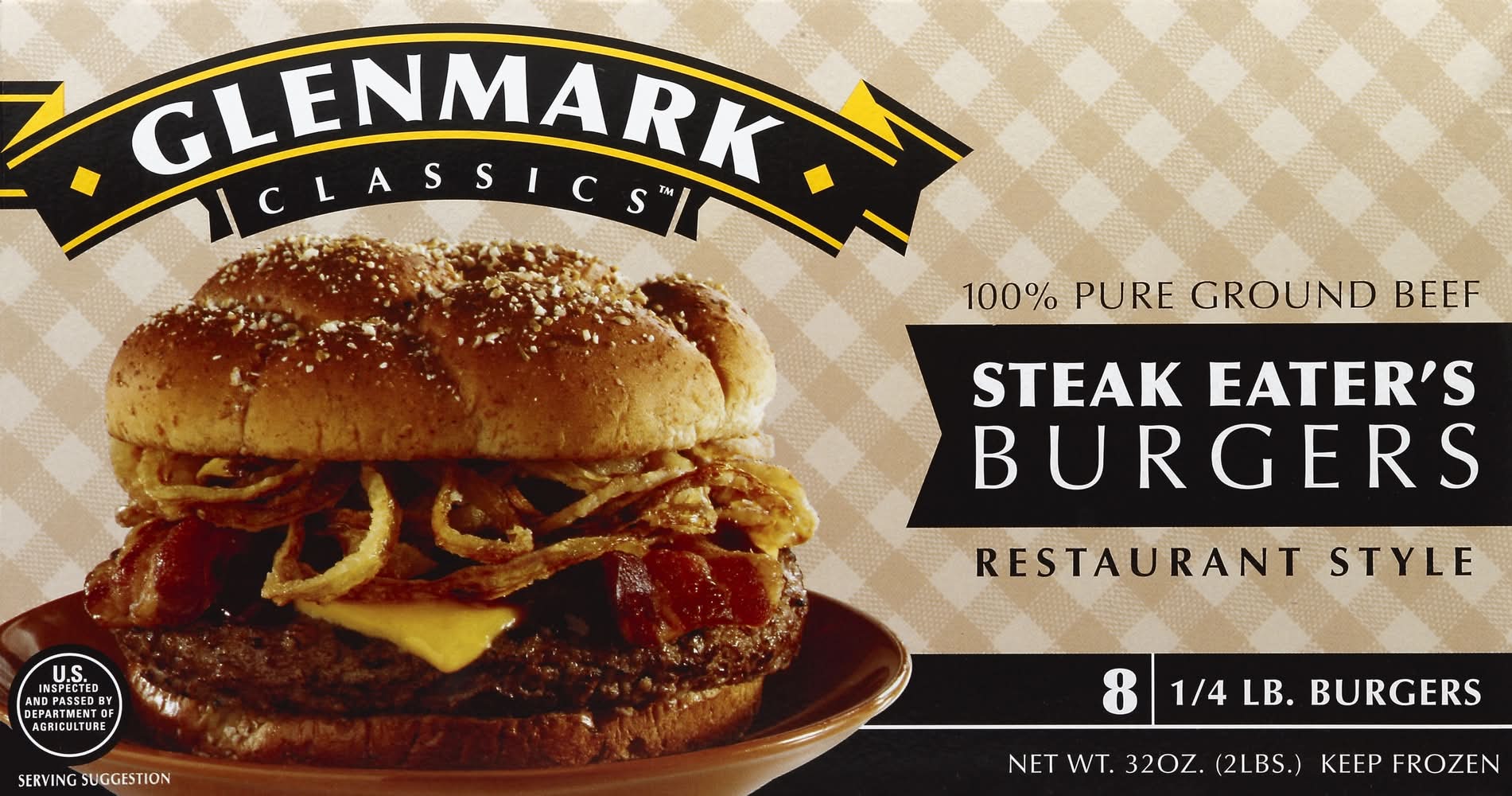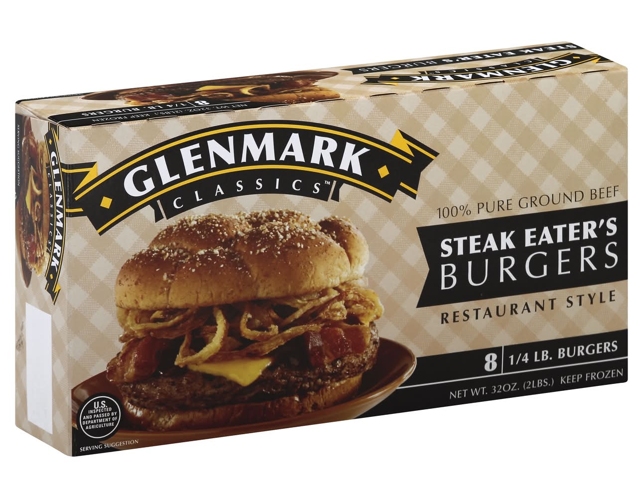 Keep frozen. cooking instructions: glenmark steak eater's burgers are at their best when cooked directly from the freezer. outdoor grill: for medium: preheat grill to 350 degrees f or until charcoal briquets turn white hot, grill frozen burger 2-1/2 minutes. turn burger and cook for 2 more minutes or until 160 degrees f internal temperature. season with salt, pepper or garlic to taste. frying pan: for medium: preheat fry pan over medium-high heat; place frozen burger in uncovered pan; fry burger 2-1/2 minutes or until surface juices appear. turn and fry 2 minutes or until 160 degrees f internal temperature. season with salt, pepper or garlic to taste. note: using a covered fry pan may reduce cook time. broiler: for medium, preheat broiler; broil frozen burger for 4-1/2 minutes. if desired, turn burger at 2-1/2 minutes for even browning or until internal temperature reaches 160 degrees f. safe handling instructions: this product was prepared from inspected and passed meat and/or poultry. some food products may contain bacteria that could cause illness if the product is mishandled or cooked improperly. for your protection, follow these safe handling instructions. keep frozen. thaw in refrigerator or microwave. keep raw meat and poultry separate from other foods. wash working surfaces (including cutting boards), utensils, and hands after touching raw meat or poultry. cook thoroughly. keep hot foods hot. refrigerate leftovers immediately or discard.