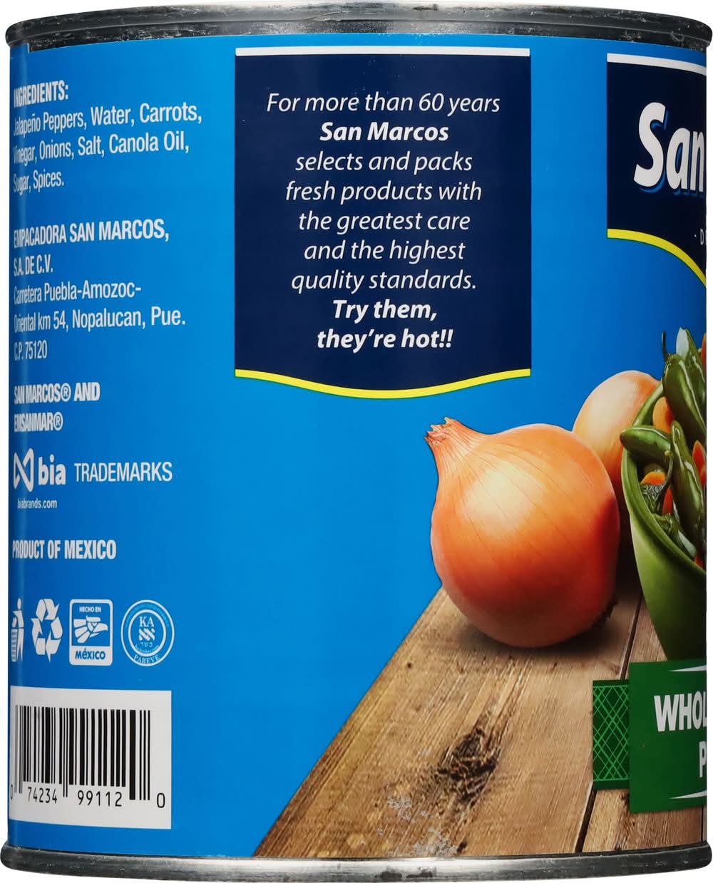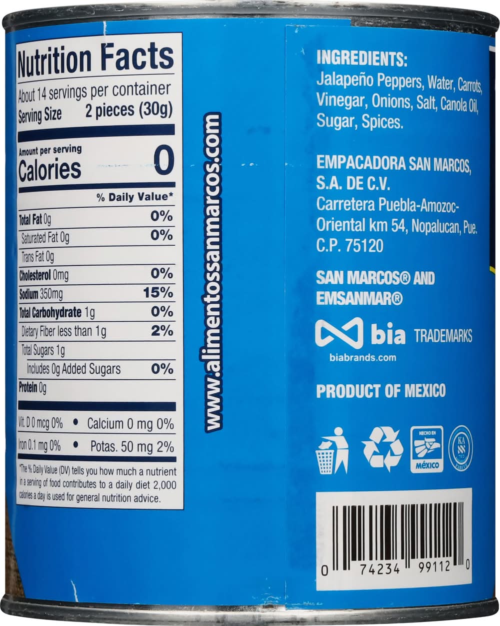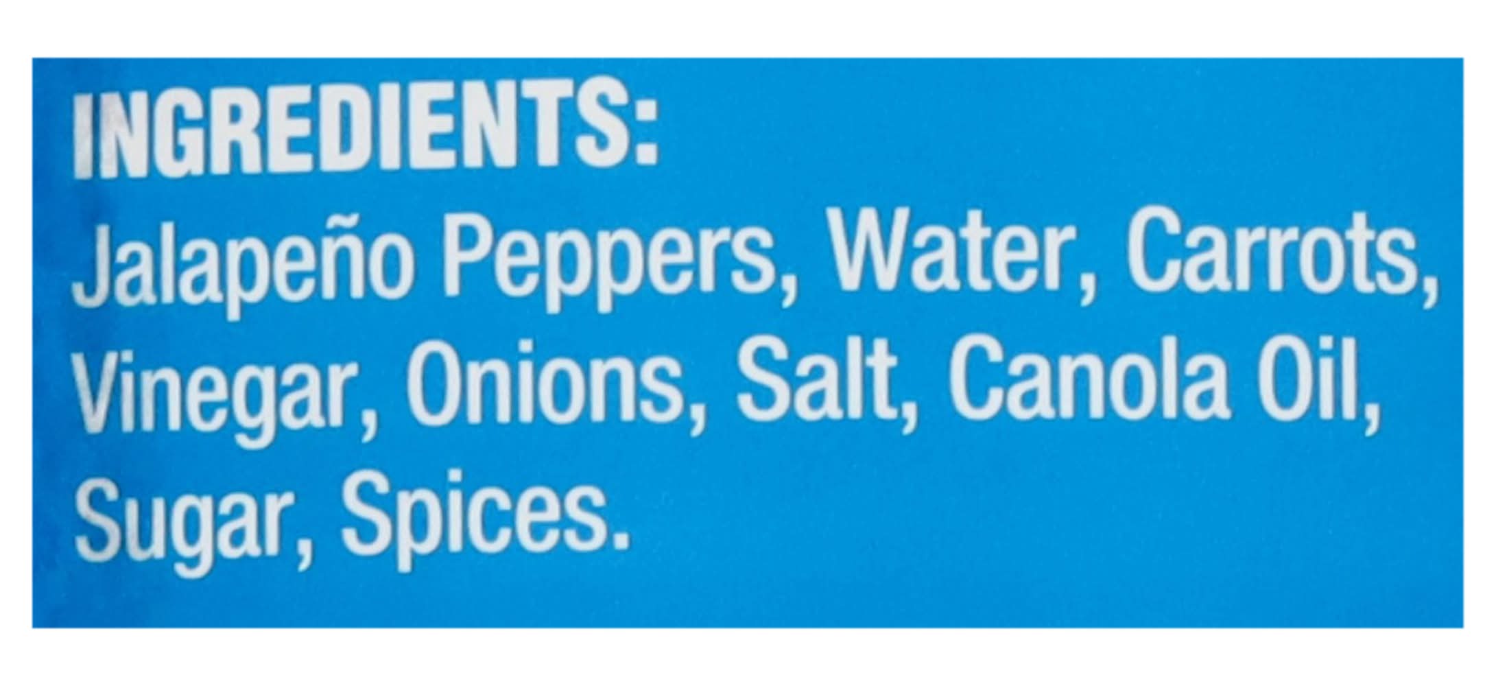 Ingredients: Jalapeno Peppers, Water, Carrots, Vinegar, Onions, Salt, Canola Oil, Sugar, Spices