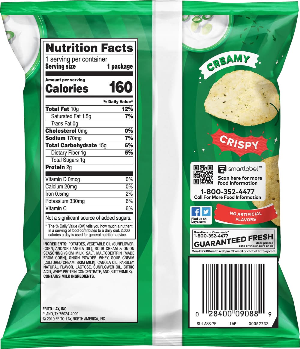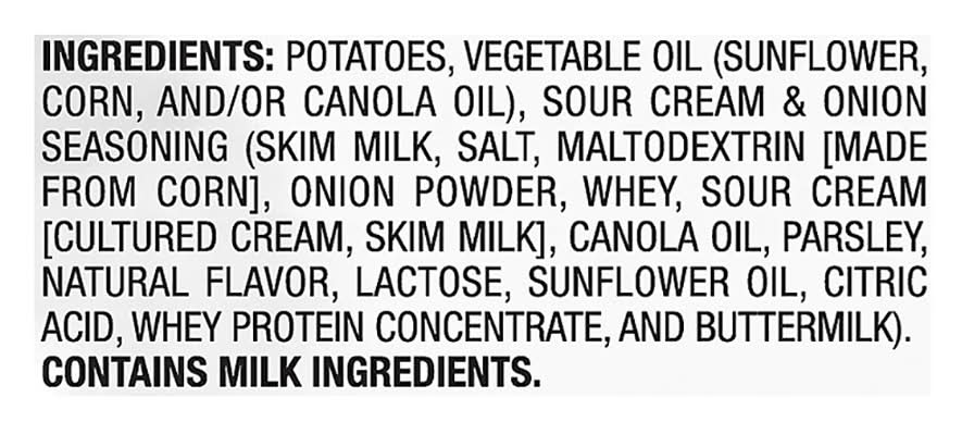 Ingredients: Potatoes, Vegetable Oil (Sunflower, Corn, and/or Canola Oil), Sour Cream & Onion Seasoning (Skim Milk, Salt, Maltodextrin [Made from Corn], Onion Powder, Whey, Sour Cream [Cultured Cream, Skim Milk], Canola Oil, Parsley, Natural Flavor, Lactose, Sunflower Oil, Citric Acid, Whey Protein Concentrate, and Buttermilk) Contains: Milk, Lactose