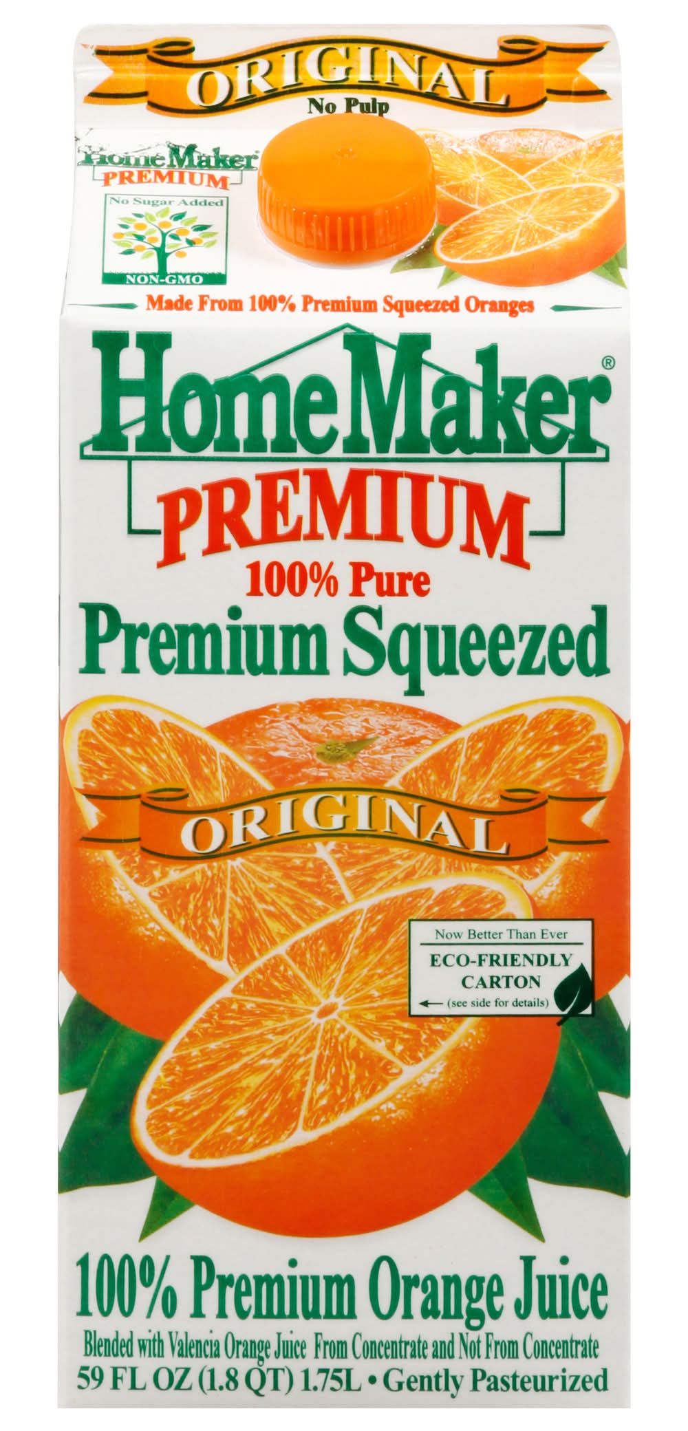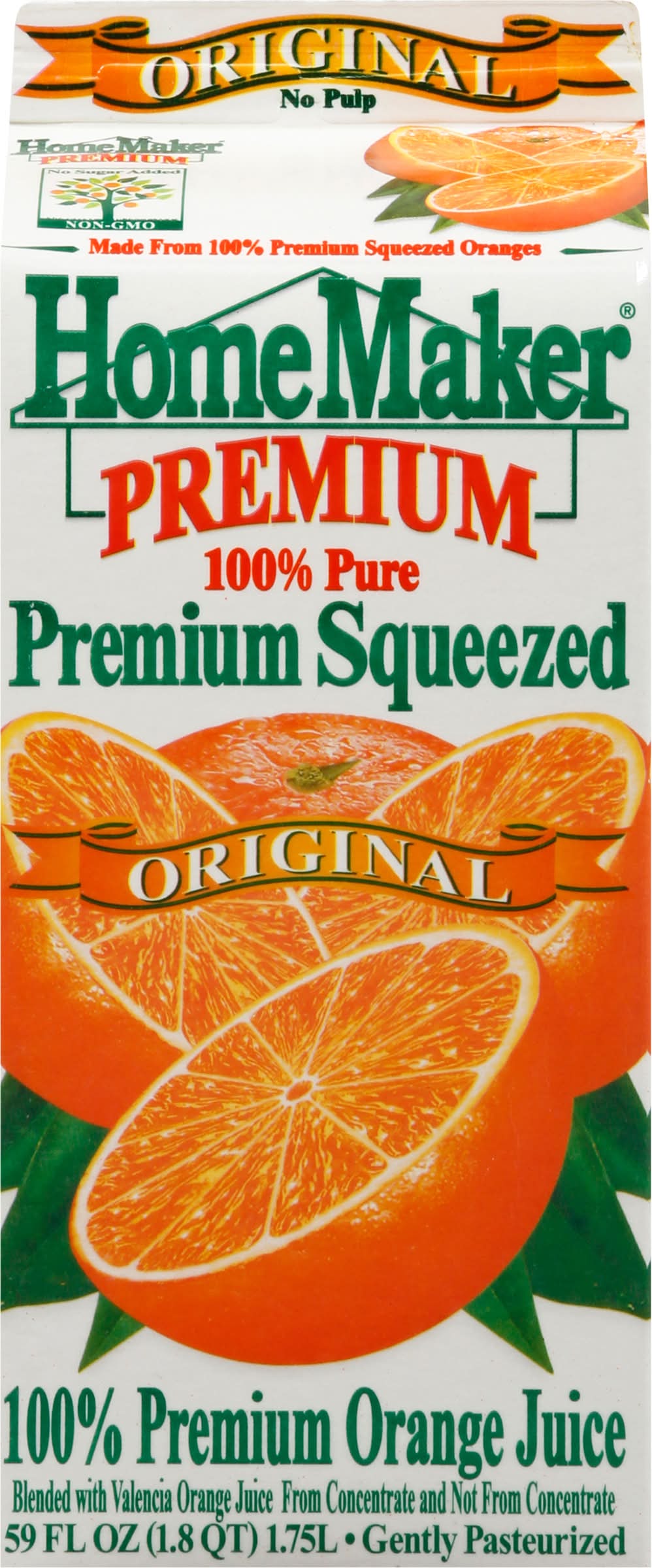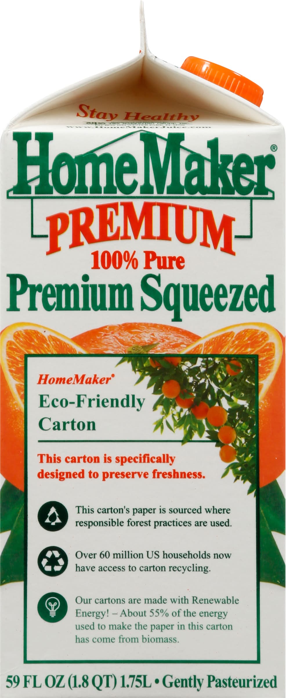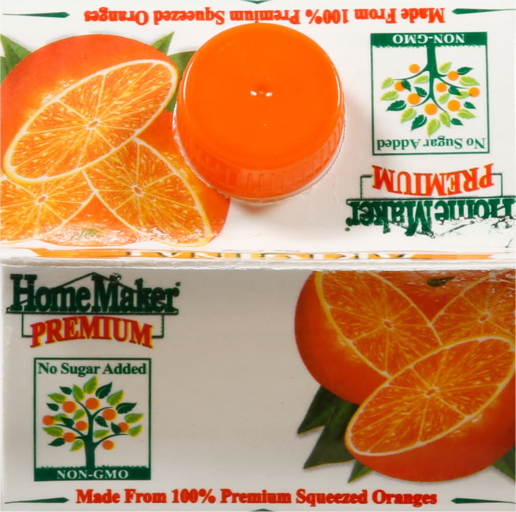 Blended with Valencia orange juice from concentrate and not from concentrate. Gluten-free. No preservatives. No sugar added. Non-GMO. 100% pure. Gently pasteurized. No pulp. Our orange juice is made from Safely-Grown and processed oranges that meet the highest standards established by the United States of America. Our orange juice is always blended with Valencia orange juice, which is one of the best quality oranges and makes a great tasting orange juice! Our orange juice contains: water, premium safely-grown and processed concentrated orange juice from USA (Florida), Mexico, Brazil, Costa Rica, Belize, and not from concentrate orange juice from Florida, which always meets the USA's highest standards. Stay Healthy: Thank you for buying HomeMaker Premium OJ. www.HomeMakerJuice.com. Now better than ever. Eco-friendly carton. This carton is specifically designed to preserve freshness. This carton's paper is sourced where responsible forest practices are used. Over 60 million US households now have access to carton recycling. Our cartons are made with renewable energy! - About 55% of the energy used to make this carton has come from biomass. Please recycle. • Number of servings: 7 • Packaging: Reusable