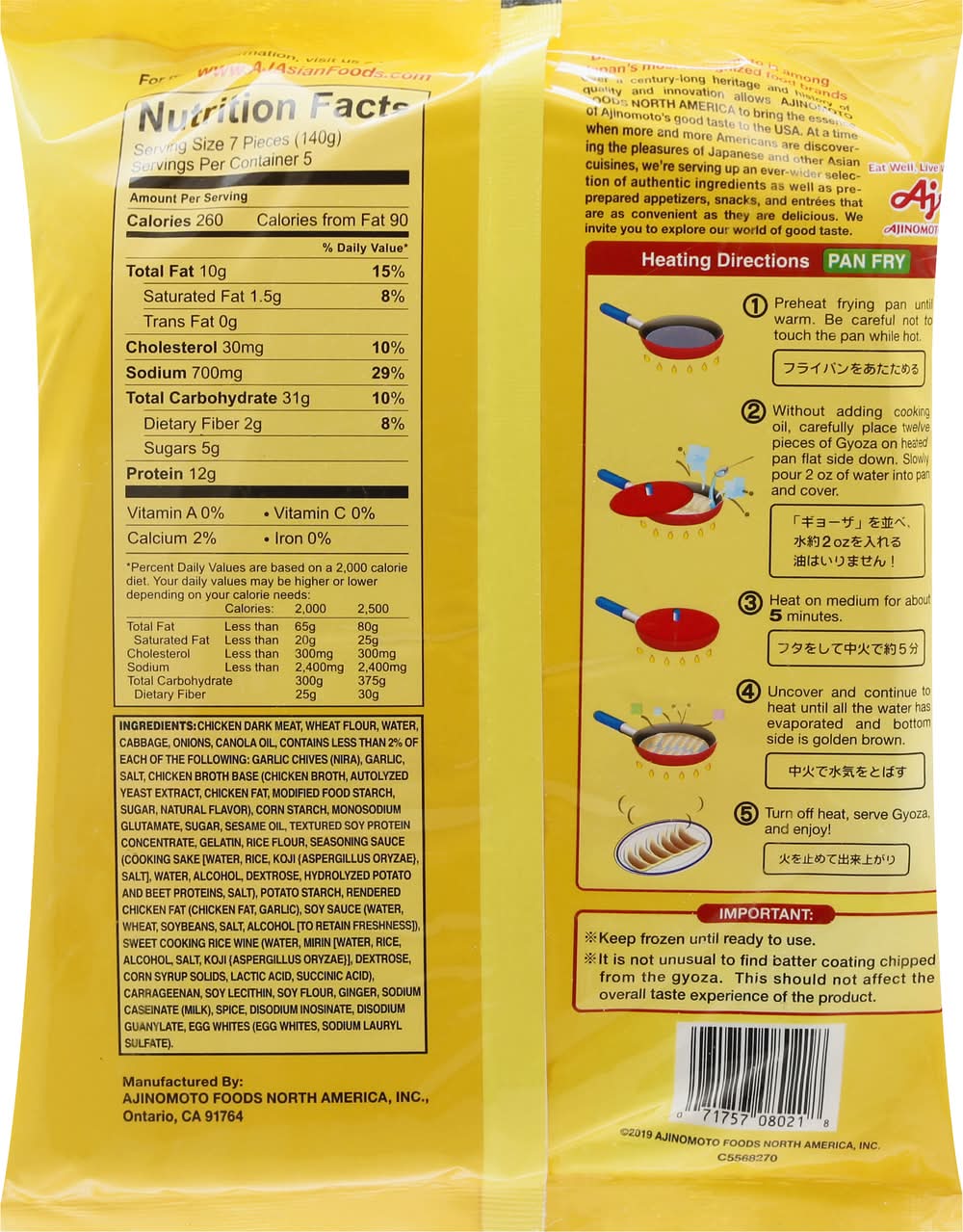 Japan’s no.1 brand of gyoza. No cooking oil needed for a perfect crisp! Discover why Ajinomoto is among Japan's most recognized food brands. Over a century-long heritage and history of quality and innovation allows Ajinomoto Foods North America to bring the essence of Ajinomoto's good taste to the USA. At a time when more and more Americans are discovering the pleasures of Japanese and other Asian cuisines, we're serving up an ever-wider selection of authentic ingredients as well as pre-prepared appetizers, snacks, and entrees that are as convenient as they are delicious. We invite you to explore our world of good taste. Eat well, live well. Inspected for wholesomeness by US Department of Agriculture. www.AJAsianFoods.com. For more information, visit us at: www.AJAsianFoods.com.