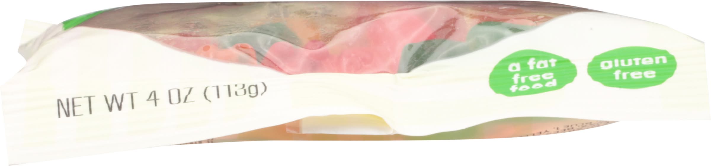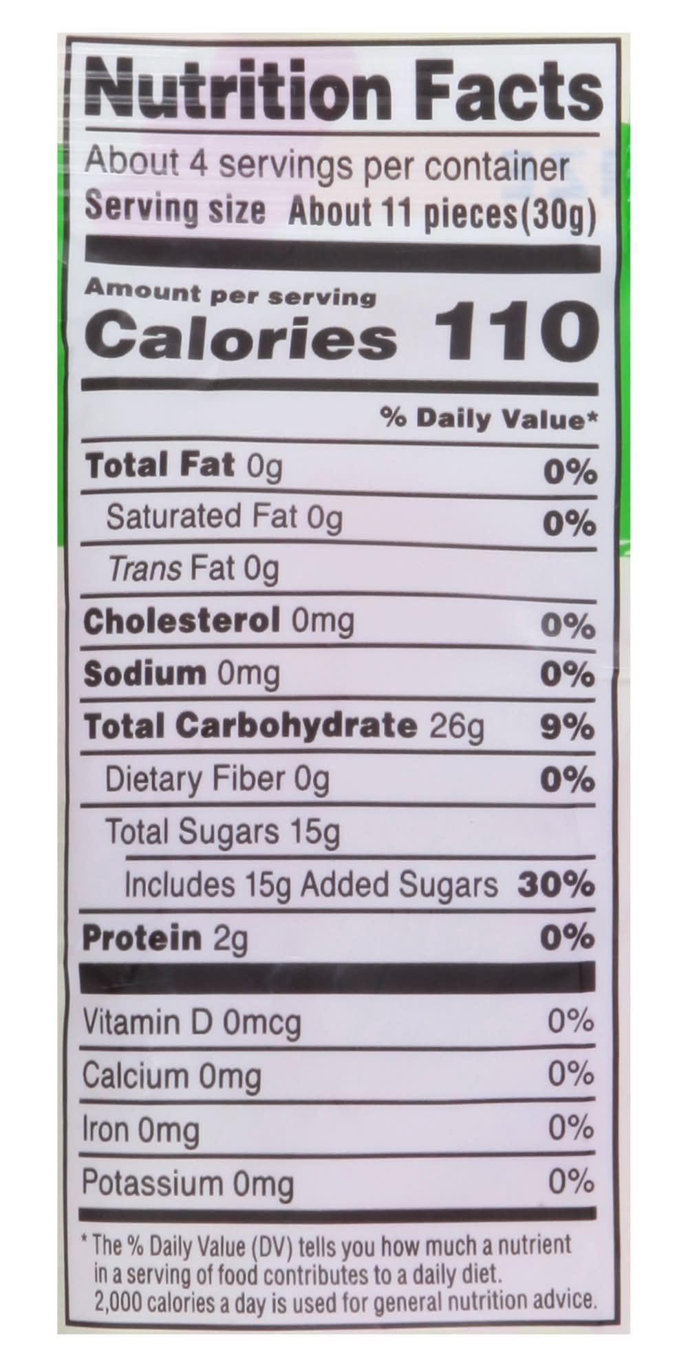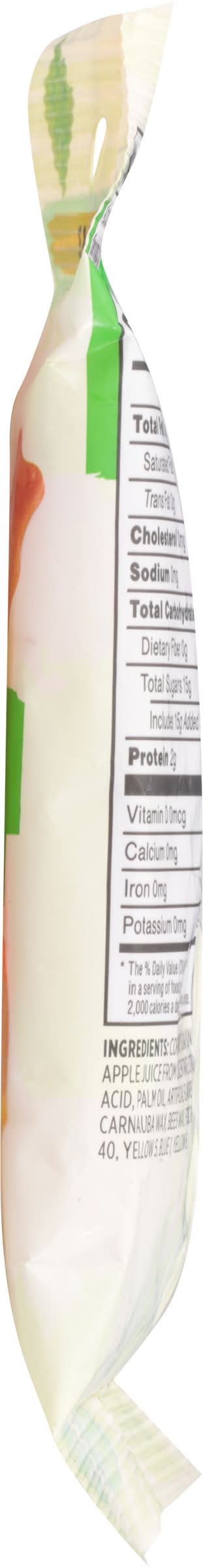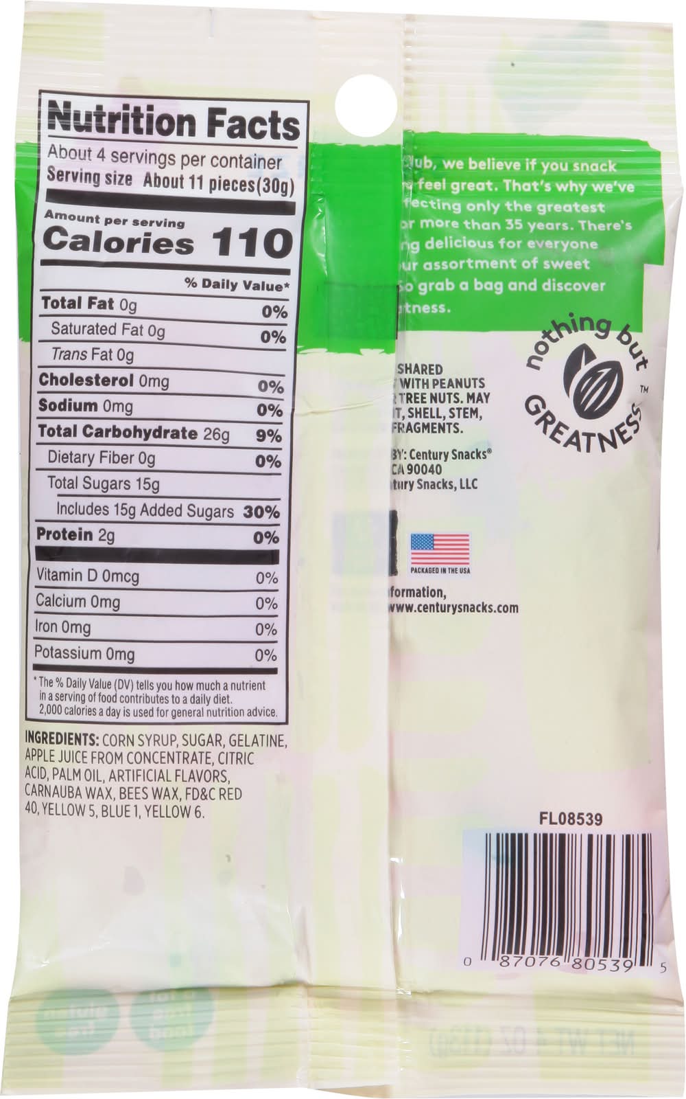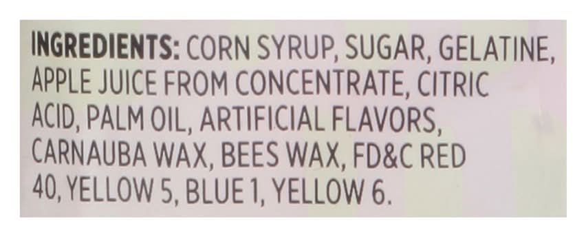 Ingredients: Corn Syrup, Sugar, Gelatine, Apple Juice from Concentrate, Citric Acid, Palm Oil, Artificial Flavors, Carnauba Wax, Bees Wax, FD&C Red 40, Yellow 5, Blue 1, Yellow 6 Contains: Corn, Peanuts, Tree Nuts