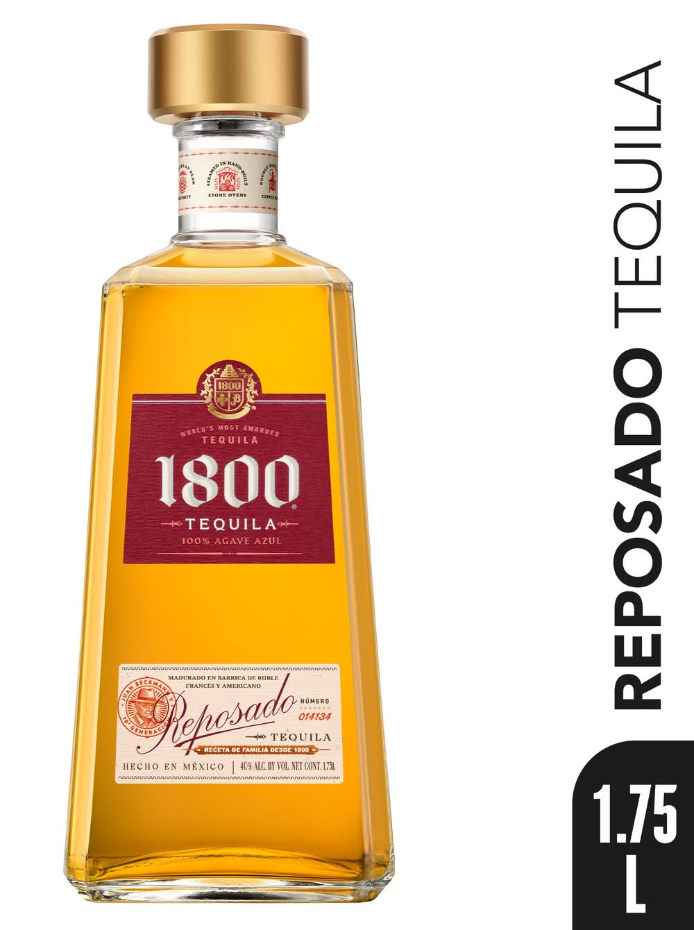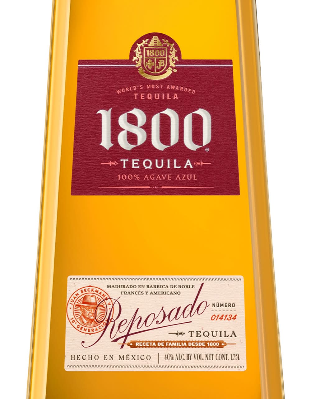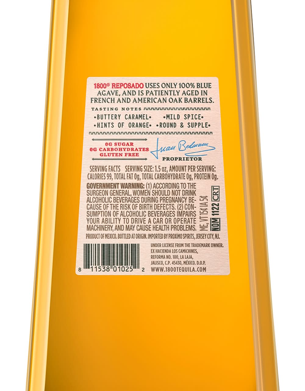 1800 Reposado tequila is crafted using 100% Tequilana Weber blue agave cared for and handpicked by expert farmers in the highlands of Jalisco, Mexico. A selection of double-distilled white tequilas are blended together then matured in French and American oak barrels. This rich liquid has notes of buttery caramel, mild spices and a touch of smokiness, which is imparted by the finishing process. Perfect mixed in a cocktail or on the rocks. (ABV 40% - 80 proof) • Brand: 1800 • Category: Reposado tequila • Alcohol by volume: 40% • Proximo, Jersey City, NJ