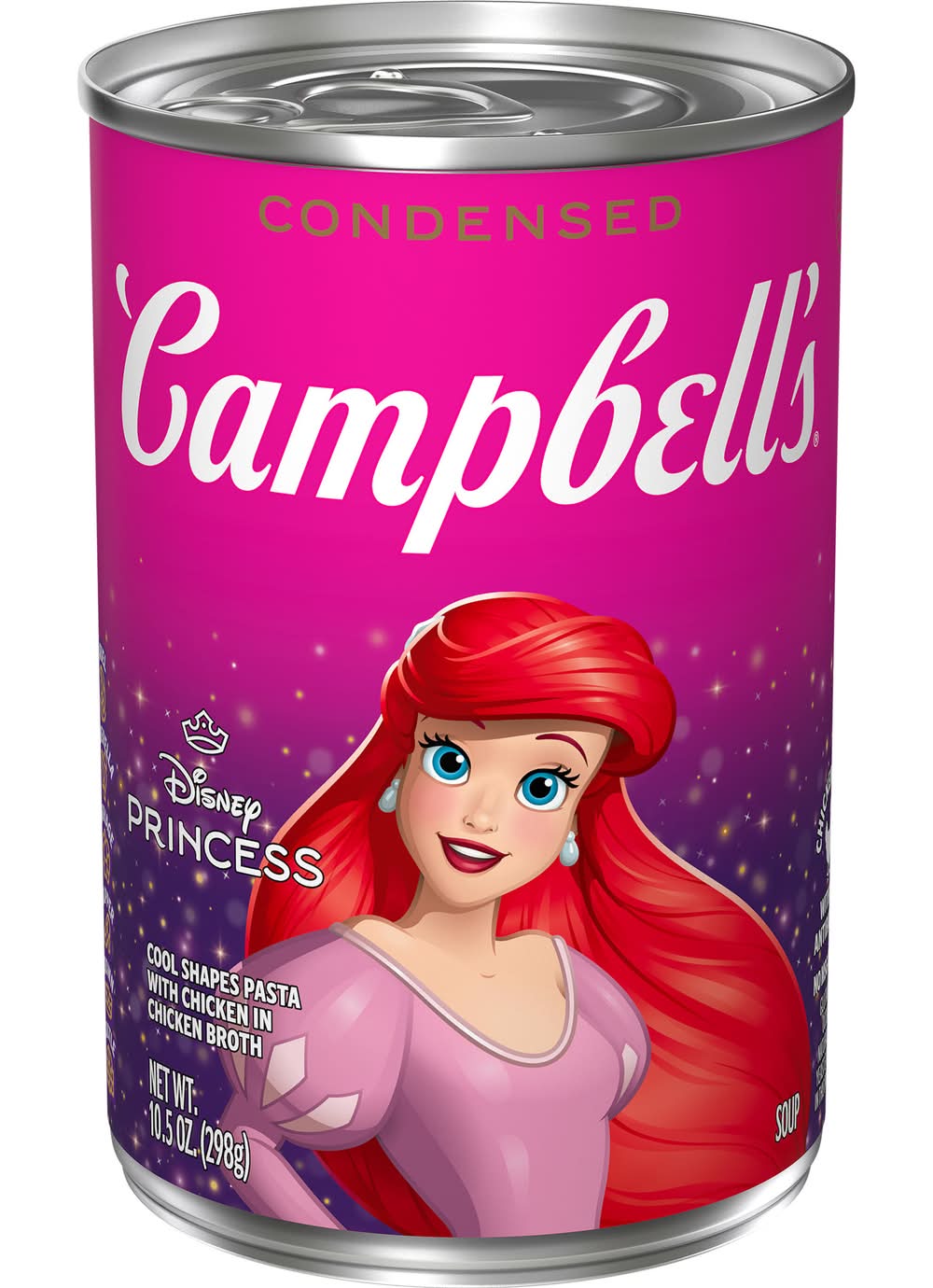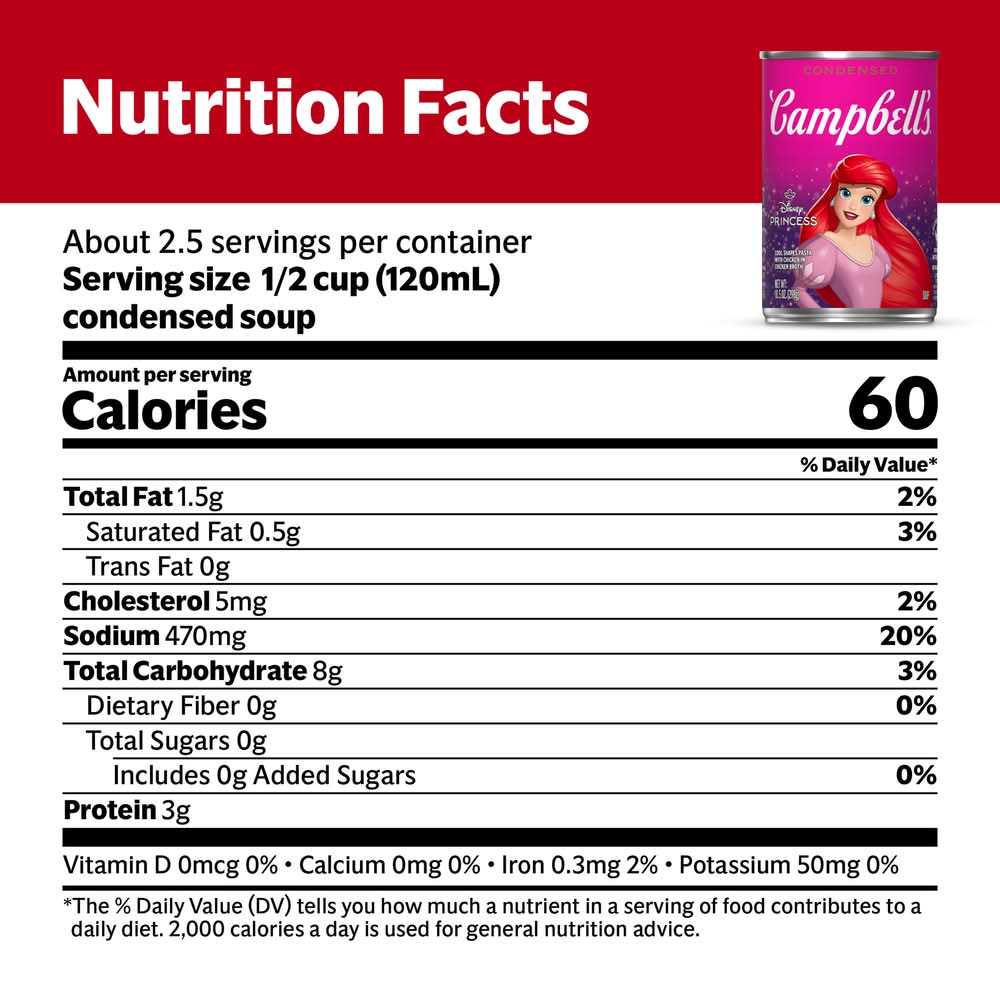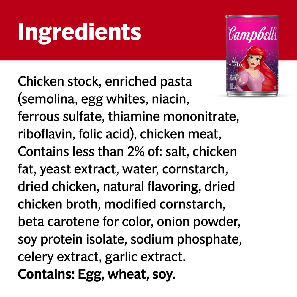 Make mealtime magical with a bowl of Campbell’s Condensed Kids Soup, Disney Princess Cool Shapes Pasta With Chicken in Chicken Broth. This enchanting chicken soup is crafted with savory chicken broth, tender chicken meat with no antibiotics, and Disney Princess-themed pasta shapes – including Ariel, Cinderella, carriages, slippers, crowns, and castles. The result is a fun, kid-friendly alternative to traditional chicken noodle soup. Top this playful kids soup with Pepperidge Farm Goldfish Crackers, or pair it with a sandwich for something quick and easy. Our convenient canned soup is a year-round pantry staple and the perfect comfort food on a chilly day or when your kiddo’s feeling under the weather. Simply mix the condensed soup with 1 can of water and microwave on high for 2.5 to 3 minutes in a covered microwave-safe bowl, or heat in a pot on the stove, stirring occasionally. Each 10.5 oz recyclable can contains about 2.5 servings of microwave soup and features a non-BPA lining. In addition to Disney Princess, Campbell’s soup is available with other character-themed shapes, including Disney Frozen and Paw Patrol. Campbell’s makes delicious soups in flavors your family knows and loves, with quality, farm-grown ingredients in every can. M’m! M’m! Good! Campbell soup company, Camden,08103-1701,NJ,USA