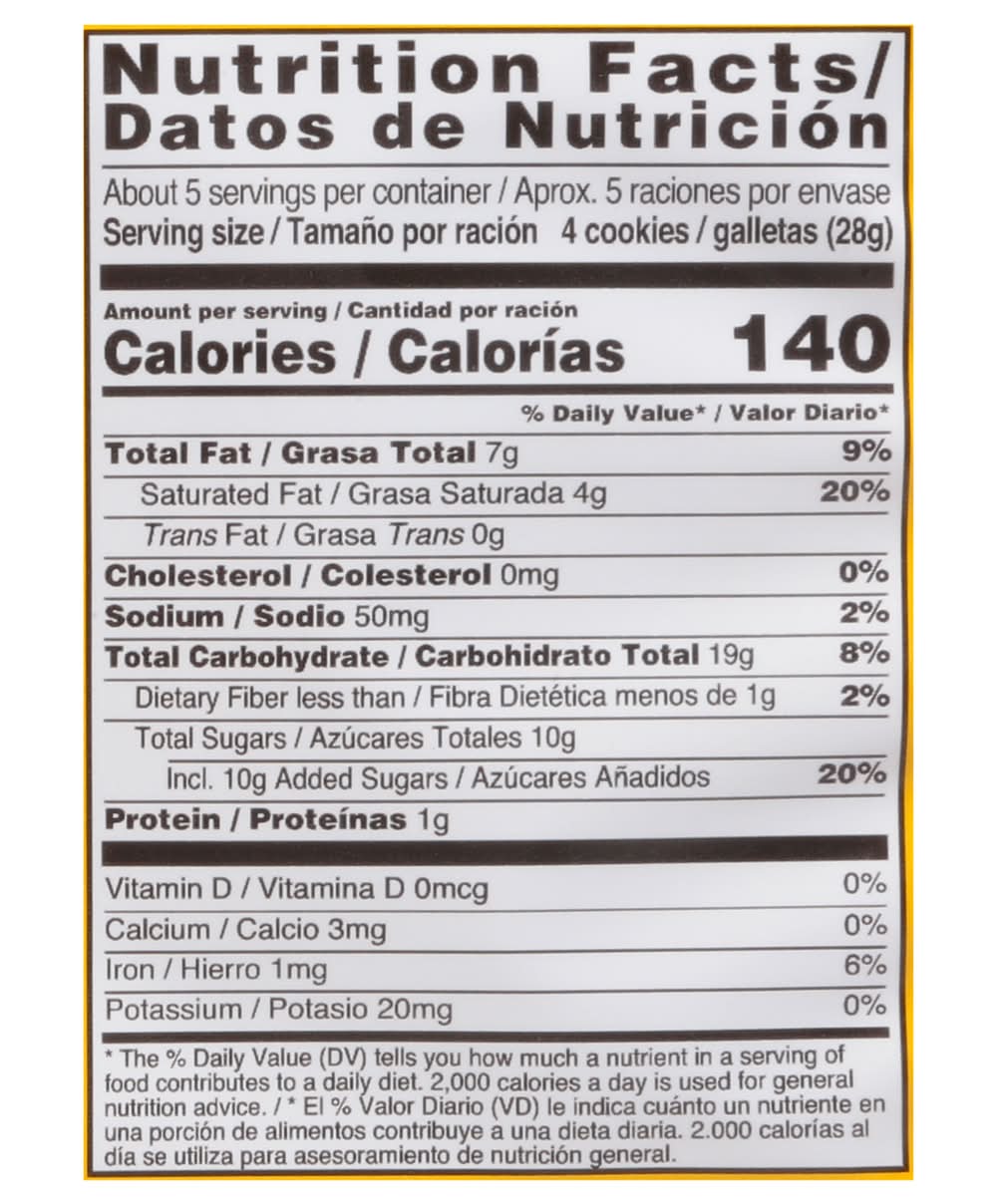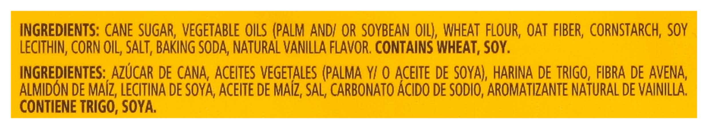 Ingredients: Cane Sugar, Vegetable Oils (Palm and/or Soybean Oil), Wheat Flour, Oat Fiber, Cornstarch, Soy Lecithin, Corn Oil, Salt, Baking Soda, Natural Vanilla Flavor Contains: Corn, Soybeans, Wheat, Oat