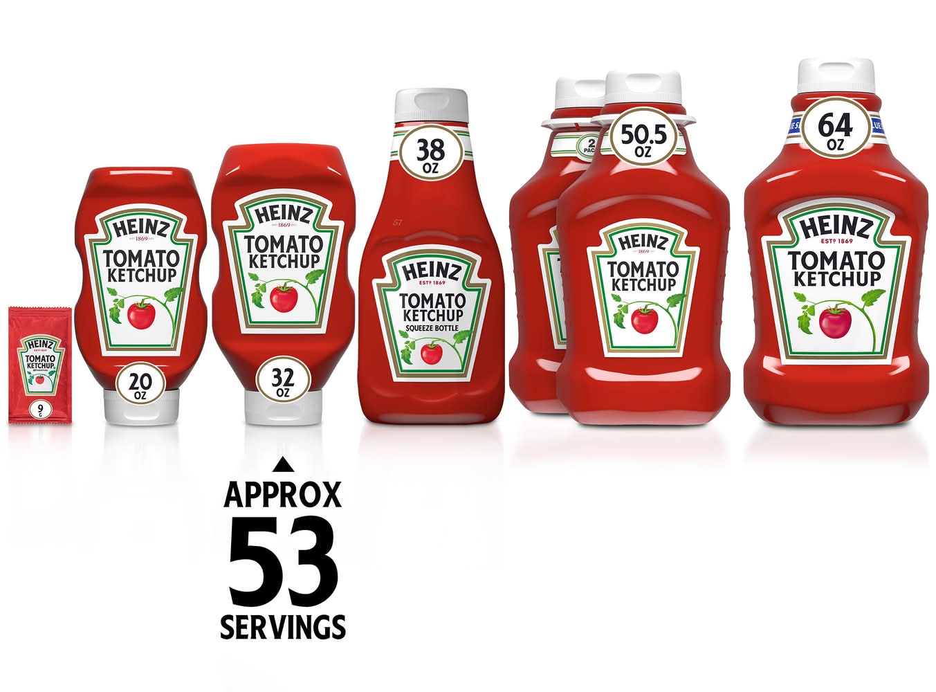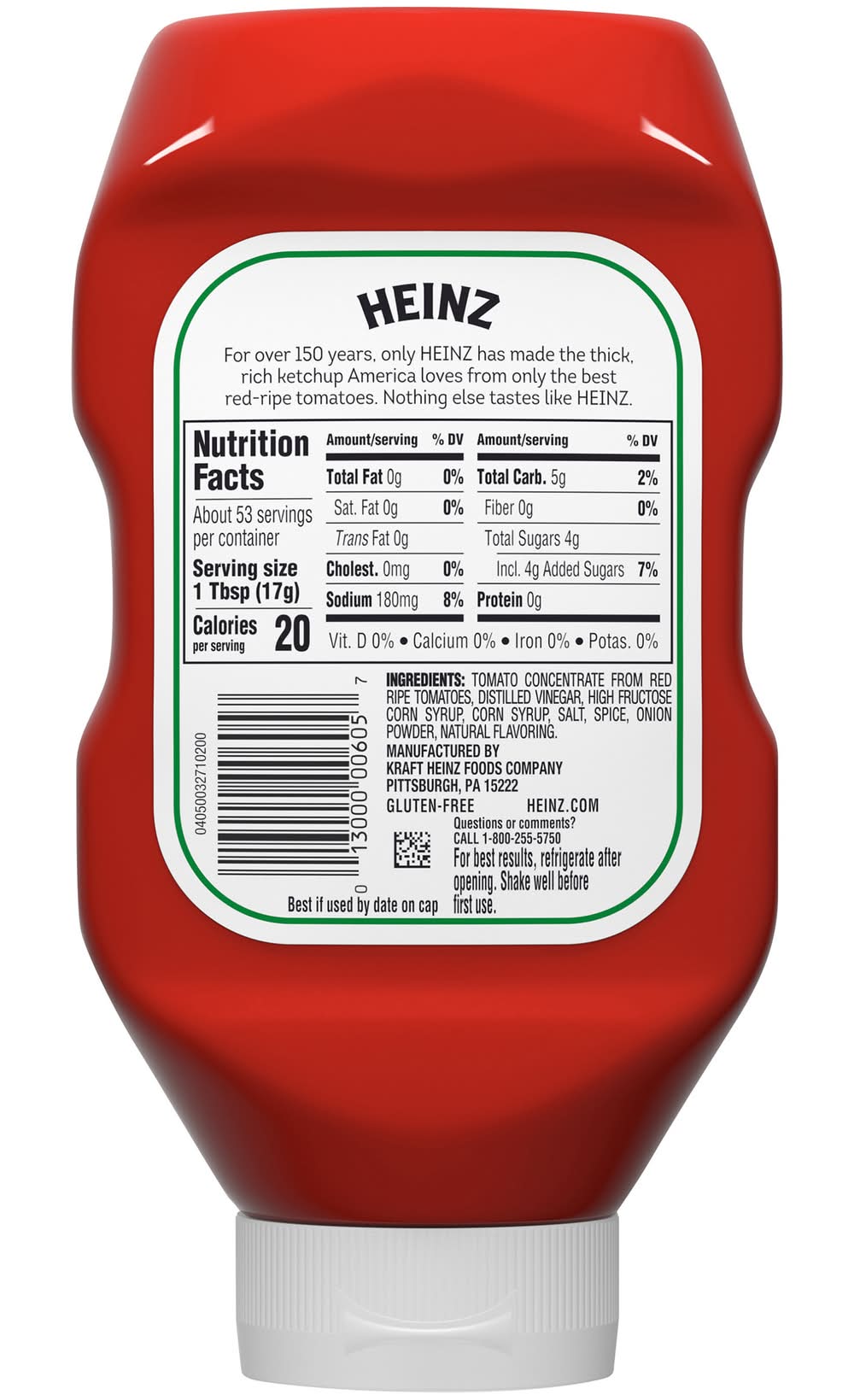 Heinz Tomato Ketchup is made only from sweet, juicy, red ripe tomatoes for the signature thick and rich taste of Americas Favorite Ketchup. Did you know that every tomato in every bottle of Heinz Ketchup is grown from Heinz seeds? Grown not made... One reason why nothing else tastes like Heinz! The thick texture makes our ketchup perfect as a topping or for dipping. It's gluten free and great for those keeping Kosher to fit your preferences. Reach for our ketchup at every cookout to top your favorite burgers, hot dogs and fries. Packed in ketchup bottles for easy sharing, this condiment is your go-to option for gatherings and everyday meals.