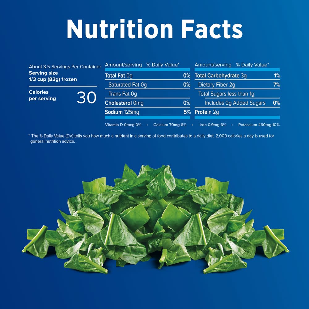 Whether you're looking for a tasty side dish or convenient recipe ingredients, Frozen Vegetables are a delicious solution. Get creative preparing these versatile chopped spinach leaves by adding them to your favorite smoothie blend for a delicious breakfast or use them to add an extra layer of flavor and color to prepared meals. These frozen veggies contain and have nothing artificial. These microwavable vegetables can be steamed in a microwave-safe dish or prepared on your stovetop. • Conagra brands, PO Box 3534, Chicago, IL, 60654 • Packaging: Reusable