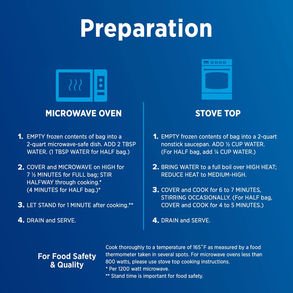 Directions for use: Cook thoroughly. Microwave Instructions: (1) Empty frozen contents of bag into a 2-quart microwave-safe dish. Add 2 tbsp water. (1 tbsp water for half bag.). (2) Cover and microwave on high for 7-1/2 minutes for full bag; stir halfway through cooking. (4 minutes for half bag) (Per 1200 watt microwave). (3) Let stand for 1 minute after cooking (Stand time is important for food safety). (4) Drain and serve. Stovetop Instructions: (1) Empty frozen contents of bag into a 2-quart non-stick saucepan. Add 1/2 cup water. (for half bag, add 1.4 cup water). (2) Bring water to a full boil over high heat; reduce heat to medium - high. (3) Cover & cook for 6 to 7 minutes, stirring occasionally. (For half bag, cover and cook for 4 to 5 minutes). (4) Drain and serve. Cook thoroughly to a temperature of 165 degrees F as measured by a food thermometer taken in several spots. Caution! Product will be hot! For microwave ovens less than 800 watts, please use stove to cooking instructions. Keep frozen. Do not thaw. Storage recommendation: Keep frozen. Do not thaw.