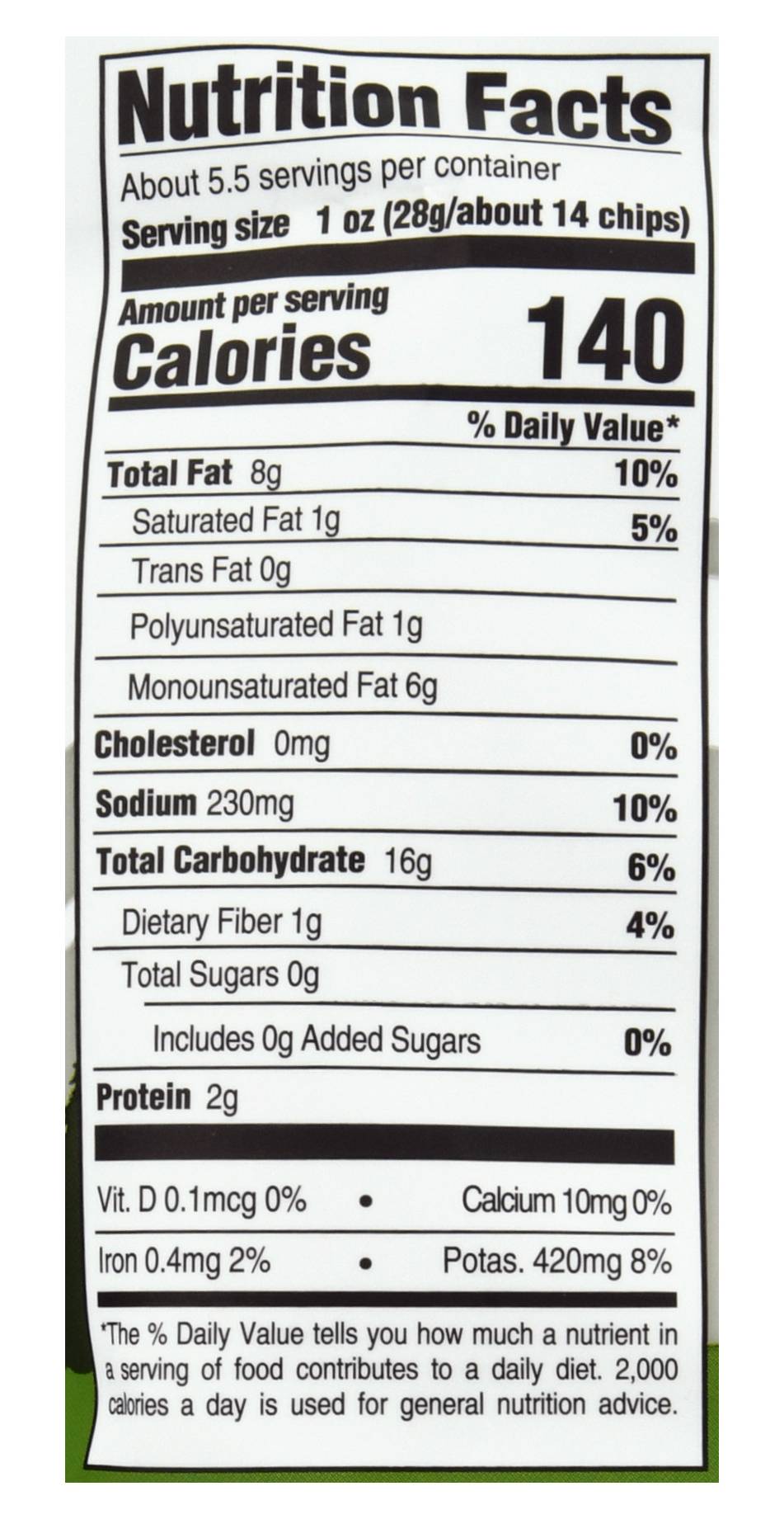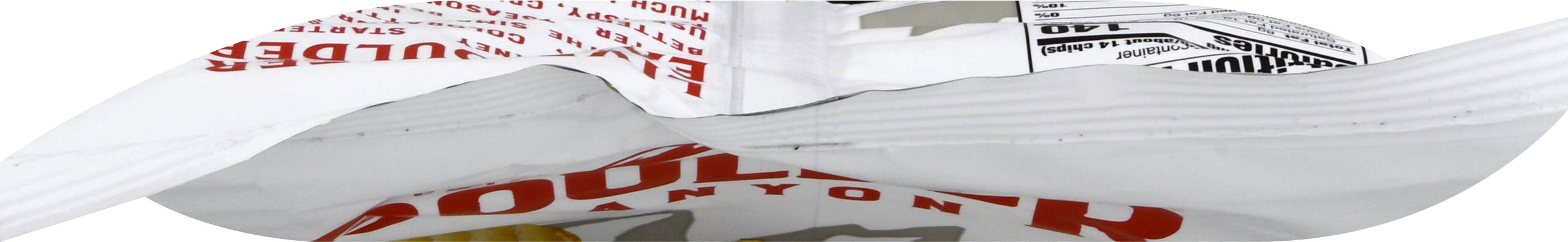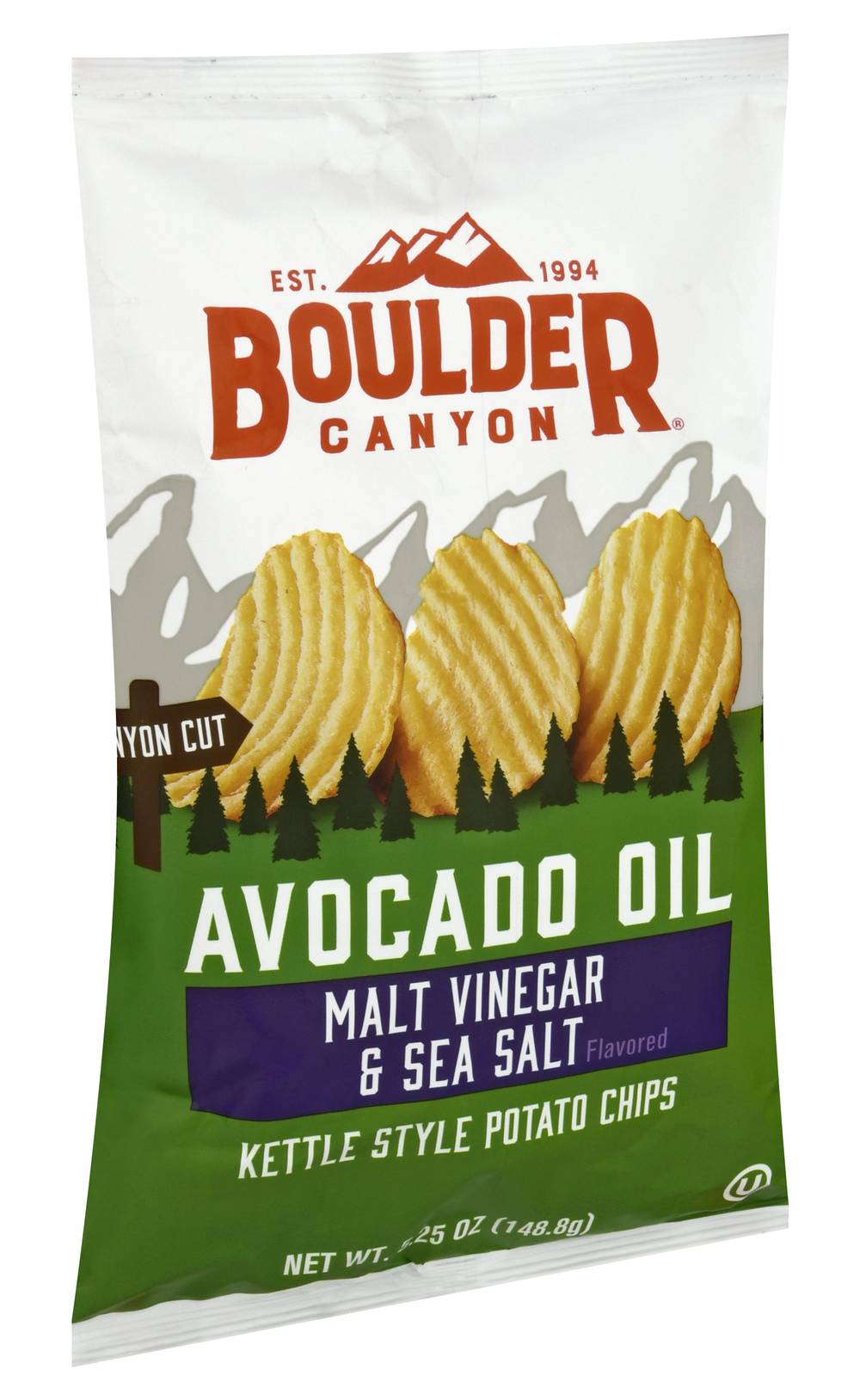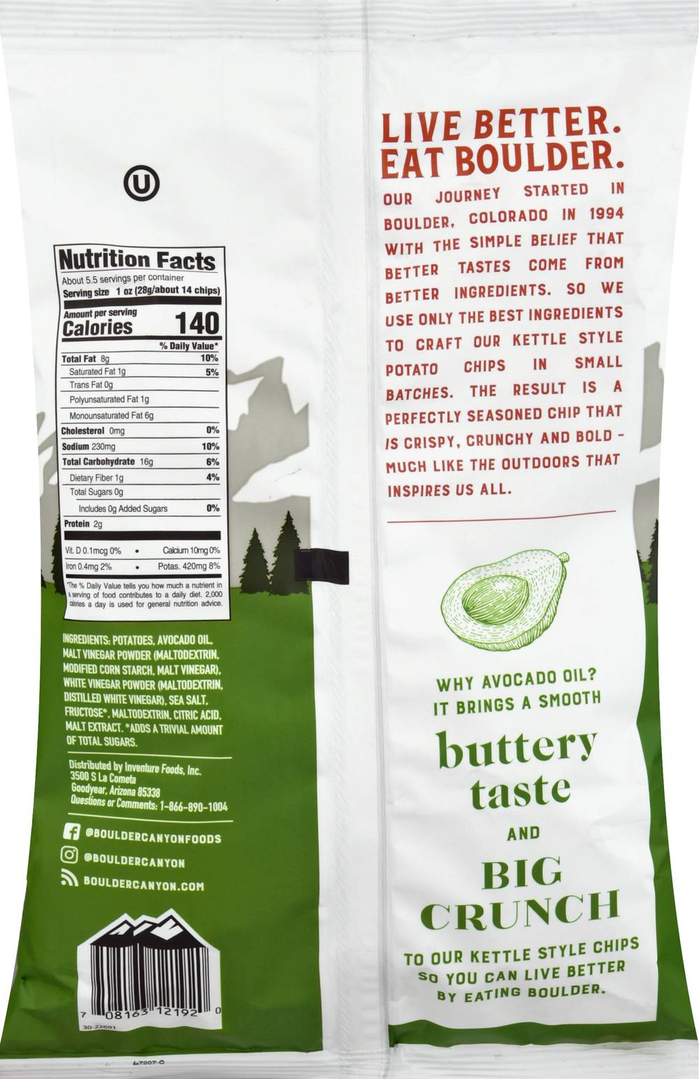 No cholesterol. Contains 8 g total fat per serving. See nutrition panel for information. Est. 1994. Canyon cut. Live better. Eat boulder. Our journey started in Boulder, Colorado in 1994 with the simple belief that better tastes come from better ingredients. So we use only the best ingredients to craft our kettle style potato chips in small batches. The result is a perfectly seasoned chip that is crispy, crunchy and bold - much like the outdoors that inspires us all. Why avocado oil? It brings a smooth buttery taste and big crunch. • Flavor: Malt vinegar-sea salt • Inventure Foods, 3500 S La Cometa,Goodyear,AZ,85338