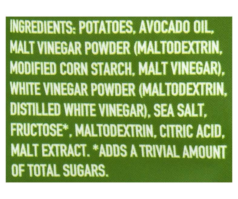 Ingredients: Potatoes, Avocado Oil, Malt Vinegar Powder (Maltodextrin Modified Corn Starch Malt Vinegar), White Vinegar Powder (Maltodextrin Distilled White Vinegar), Sea Salt, Fructose, Maltodextrin, Citric Acid, Malt Extract