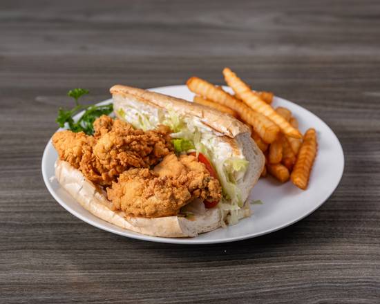 Chicken po' boy, choice of 12" or 6" with side. Options include French fries, fried rice, or lo mein.