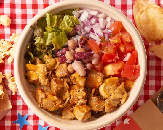 チリパウダーなどオリジナルに味付けをした鶏肉にに野菜はレタス、紫タマネギ、豆、トマトが入っておりボリューム満点。