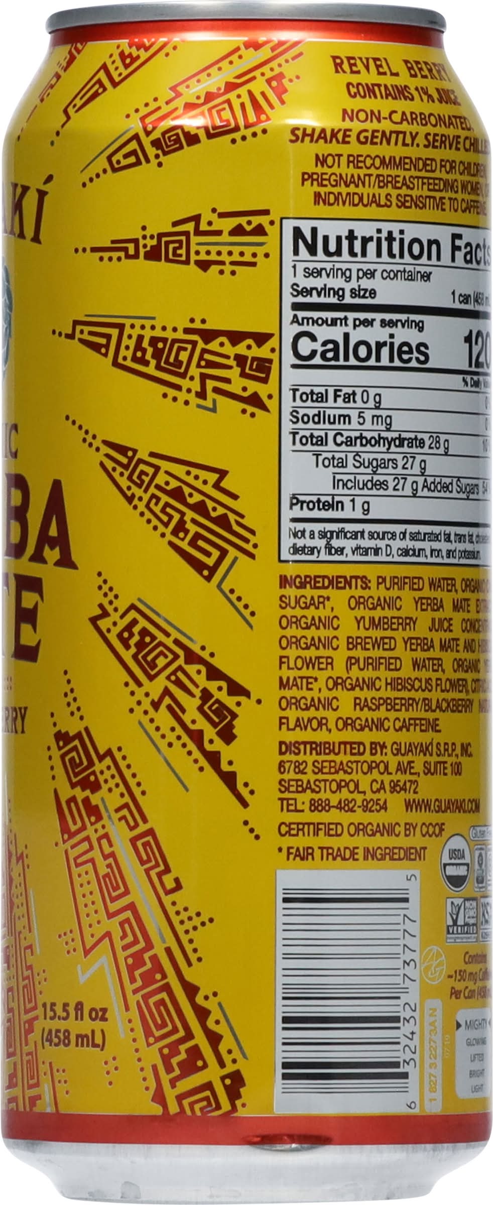 Ingredients: Purified Water, Organic Cane Sugar (Fair Trade Ingredient), Organic Yerba Mate Extract (Fair Trade Ingredient), Organic Yumberry Juice Concentrate, Organic Brewed Yerba Mate and Hibiscus Flower (Purified Water, Organic Yerba, Mate (Fair Trade Ingredient), Organic Hibiscus Flower), Citric Acid, Organic Raspberry/Blackberry Natural Flavor, Organic Caffeine