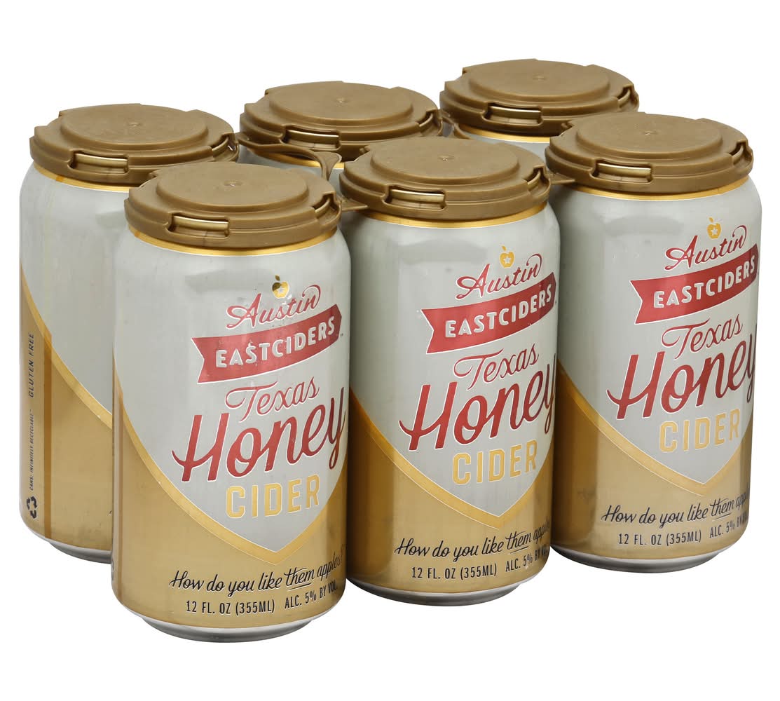 Cider, Texas Honey • Brand: Austin eastciders • Pack size: 6 • kosher, gluten-free • Alcohol by volume: 5% • Number of servings: 1 • Packaging: Reusable