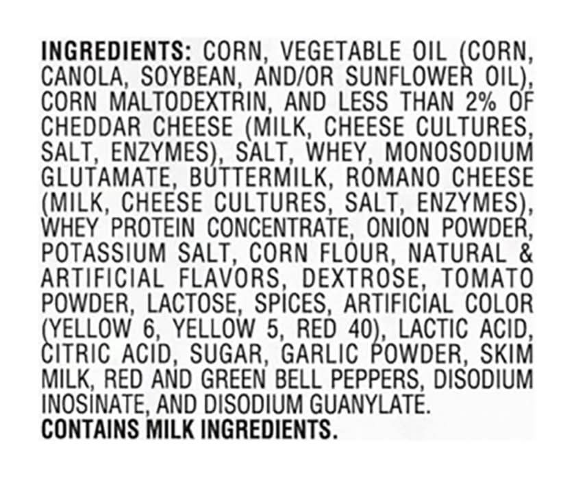 Ingredients: Corn, Vegetable Oil (Corn, Canola, Soybean, and/or Sunflower Oil), Corn Maltodextrin, and Less than 2% of Cheddar Cheese (Milk, Cheese Cultures, Salt, Enzymes), Salt, Whey, Monosodium Glutamate, Buttermilk, Romano Cheese (Milk, Cheese Cultures, Salt, Enzymes), Whey Protein Concentrate, Onion Powder, Potassium Salt, Corn Flour, Natural & Artificial Flavors, Dextrose, Tomato Powder, Lactose, Spices, Artificial Color (Yellow 6, Yellow 5, Red 40), Lactic Acid, Citric Acid, Sugar, Garlic Powder, Skim Milk, Red and Green Bell Peppers, Disodium Inosinate, and Disodium Guanylate Contains: Milk, Lactose, Soybeans